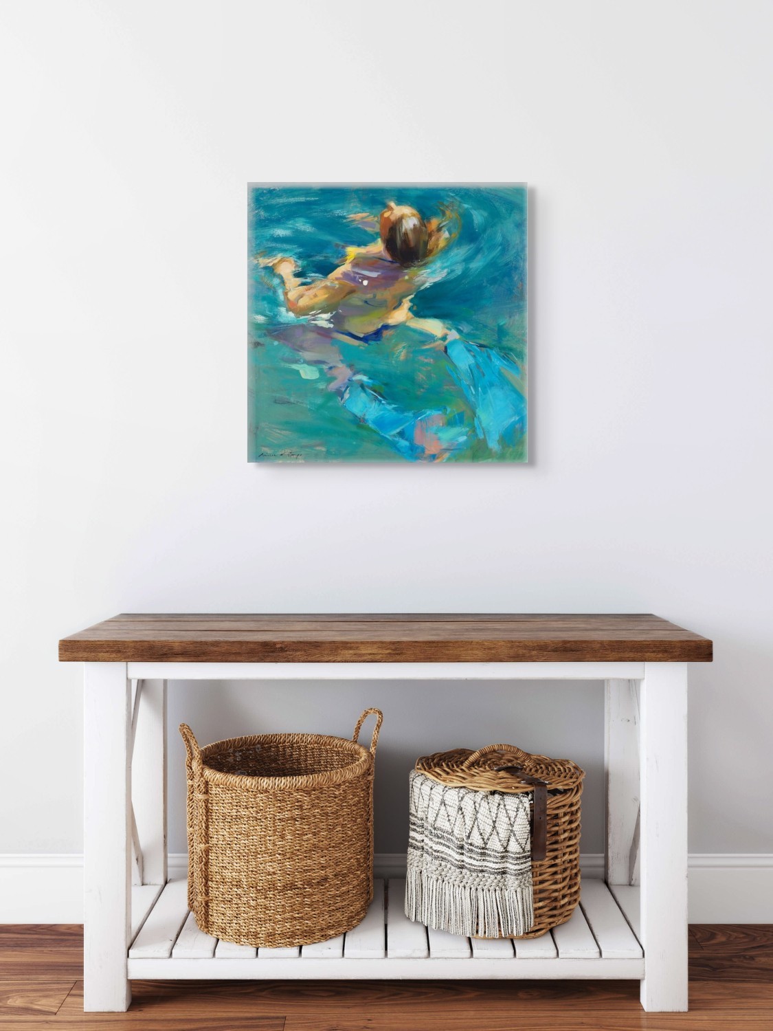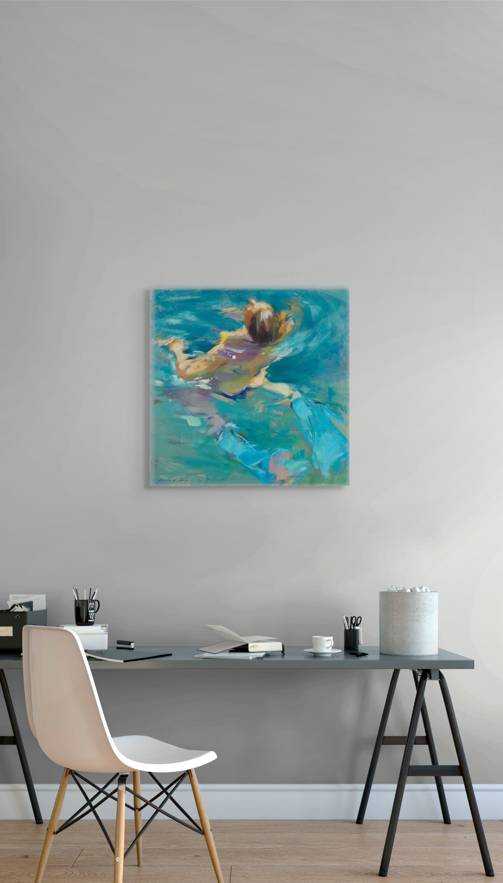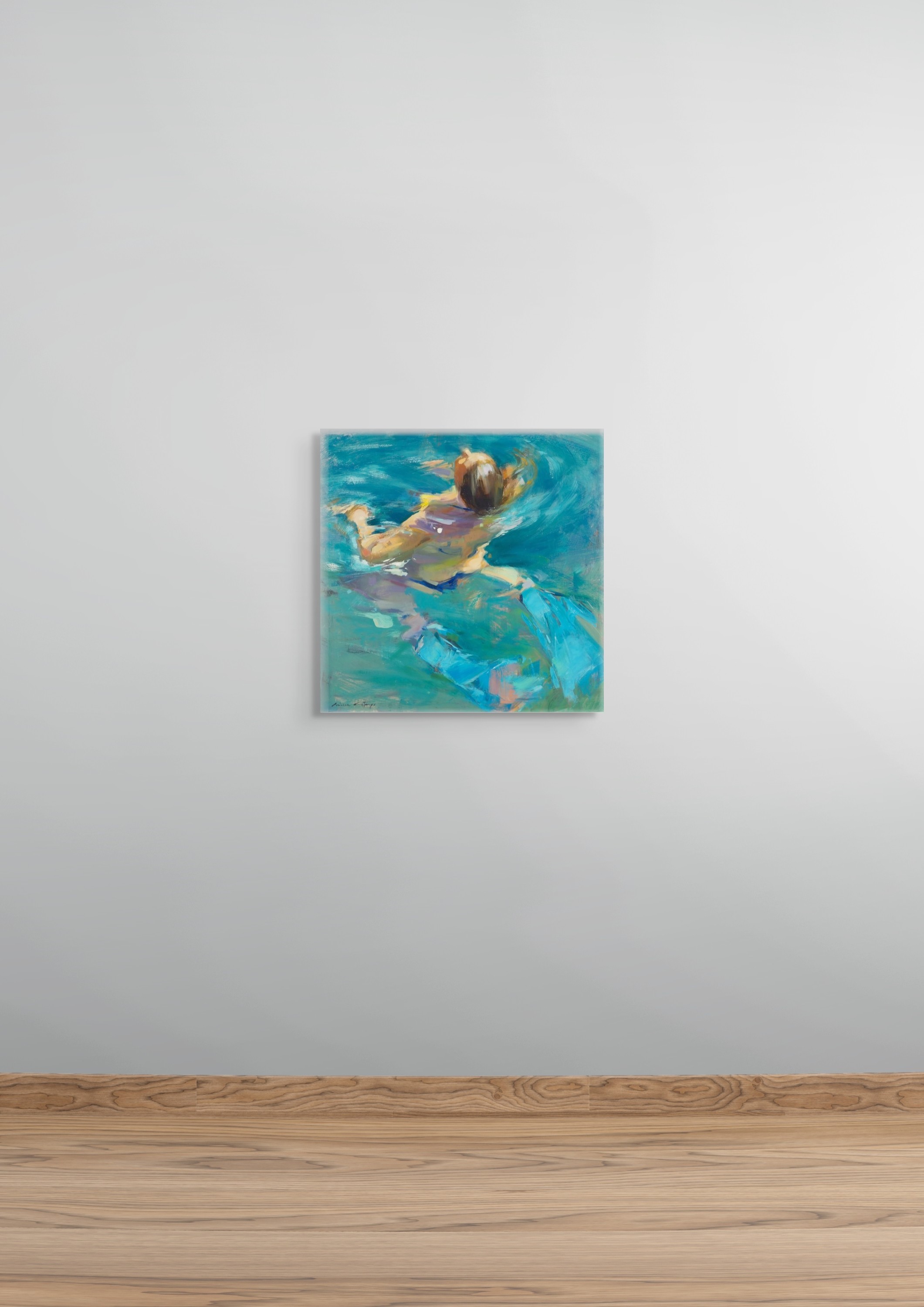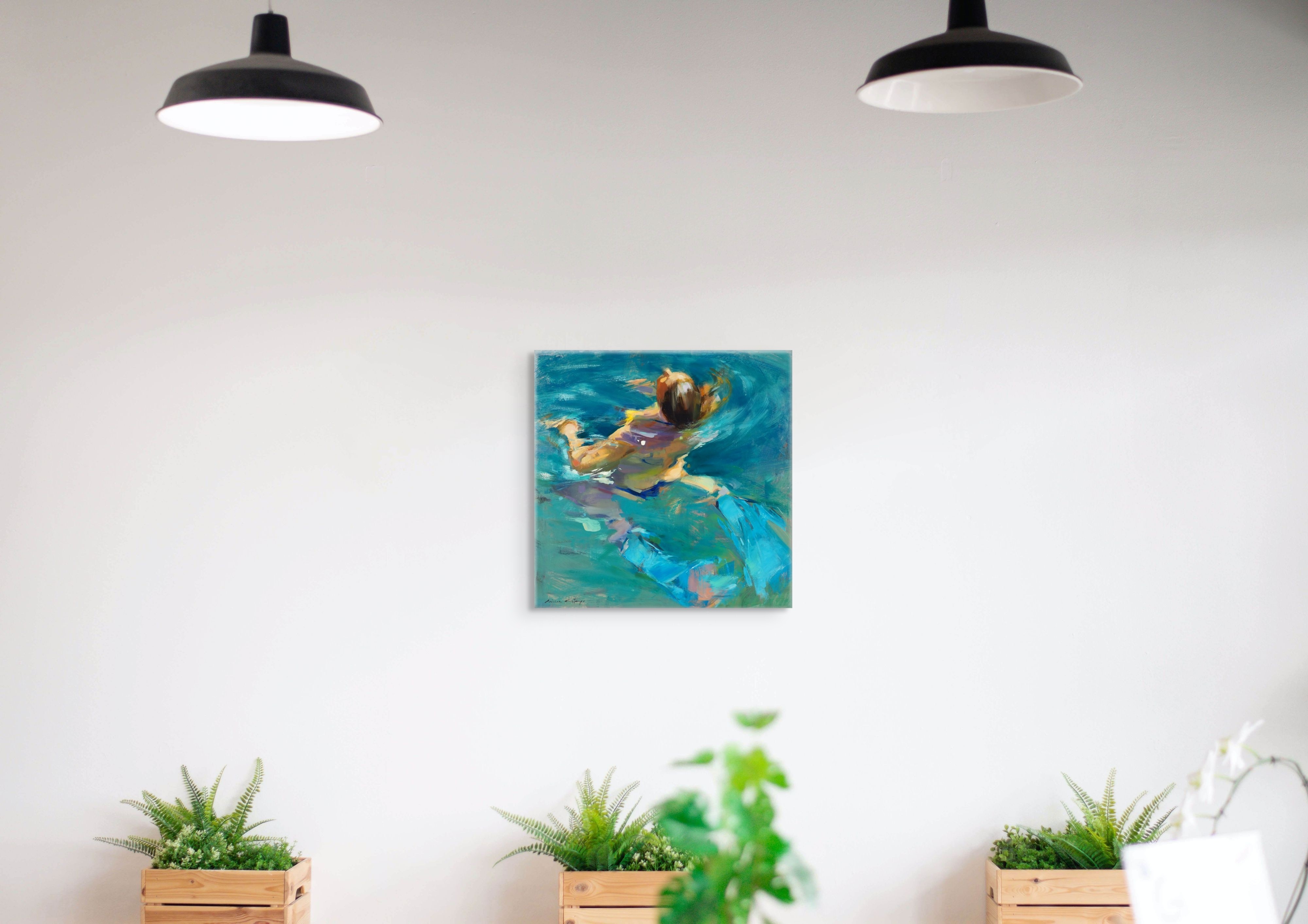 Œuvre originale de l'artiste MONICA CASTANYS, illustre une scène lumineuse d'une femme dans l’eau, capturée en pleine action. Les touches expressives et vibrantes de peinture à l’huile transmettent mouvement et fraîcheur à travers une palette riche en bleus et verts translucides.