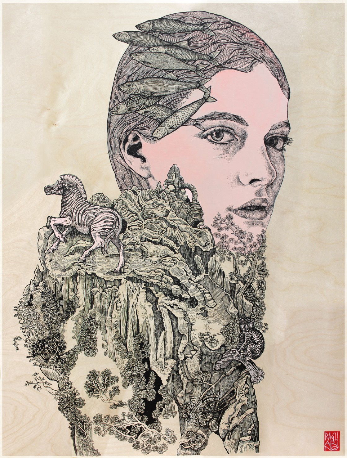 Acrylique et encre de Chine sur panneau de bois de bouleau.