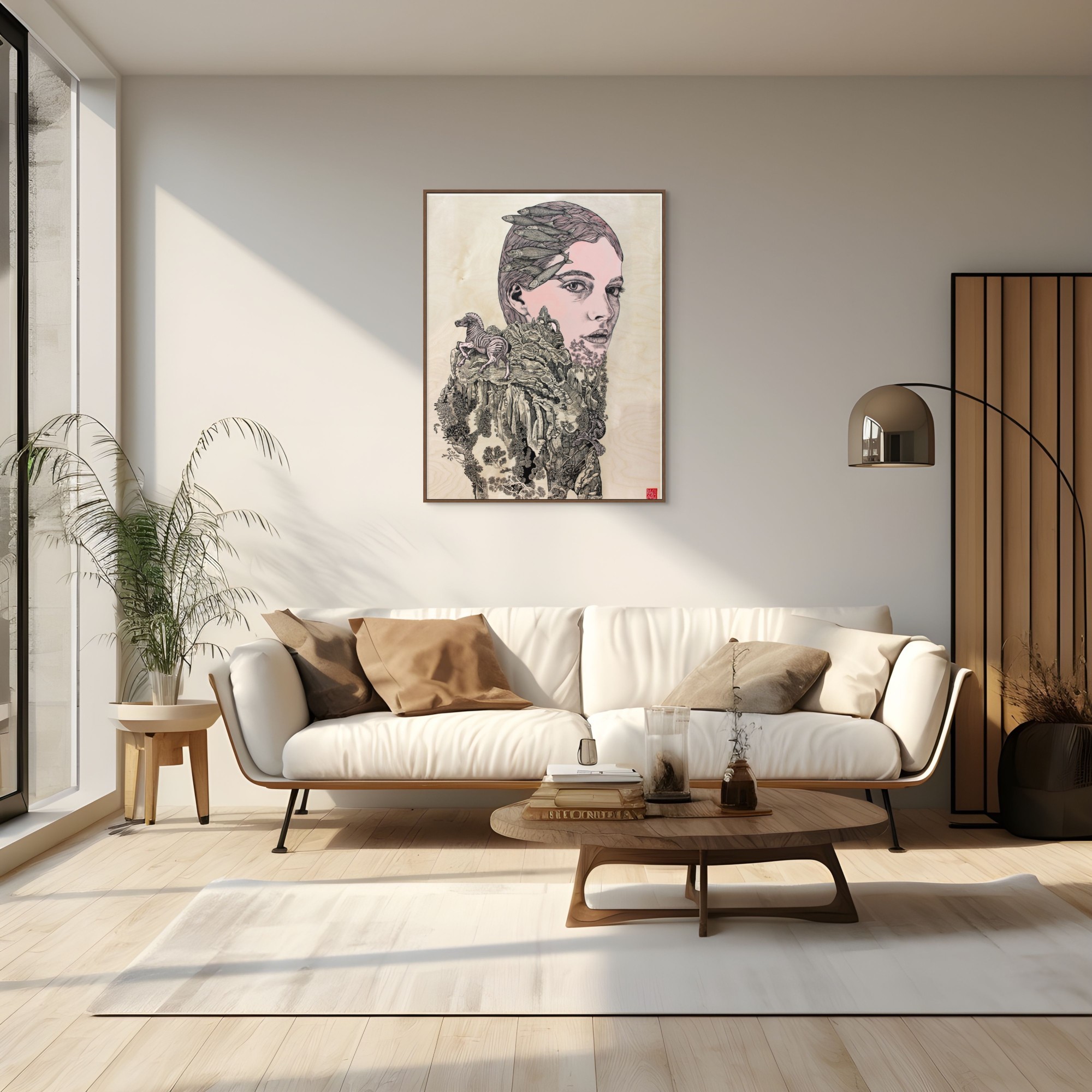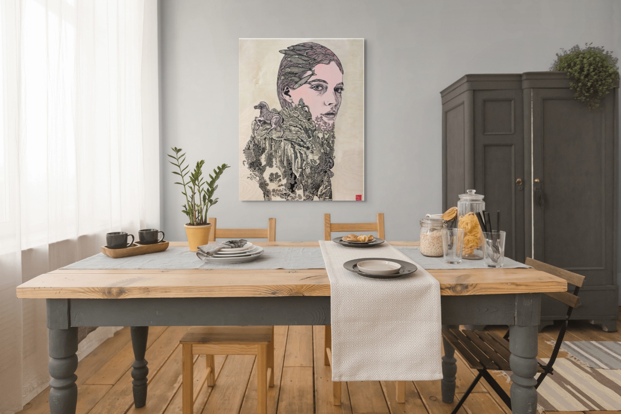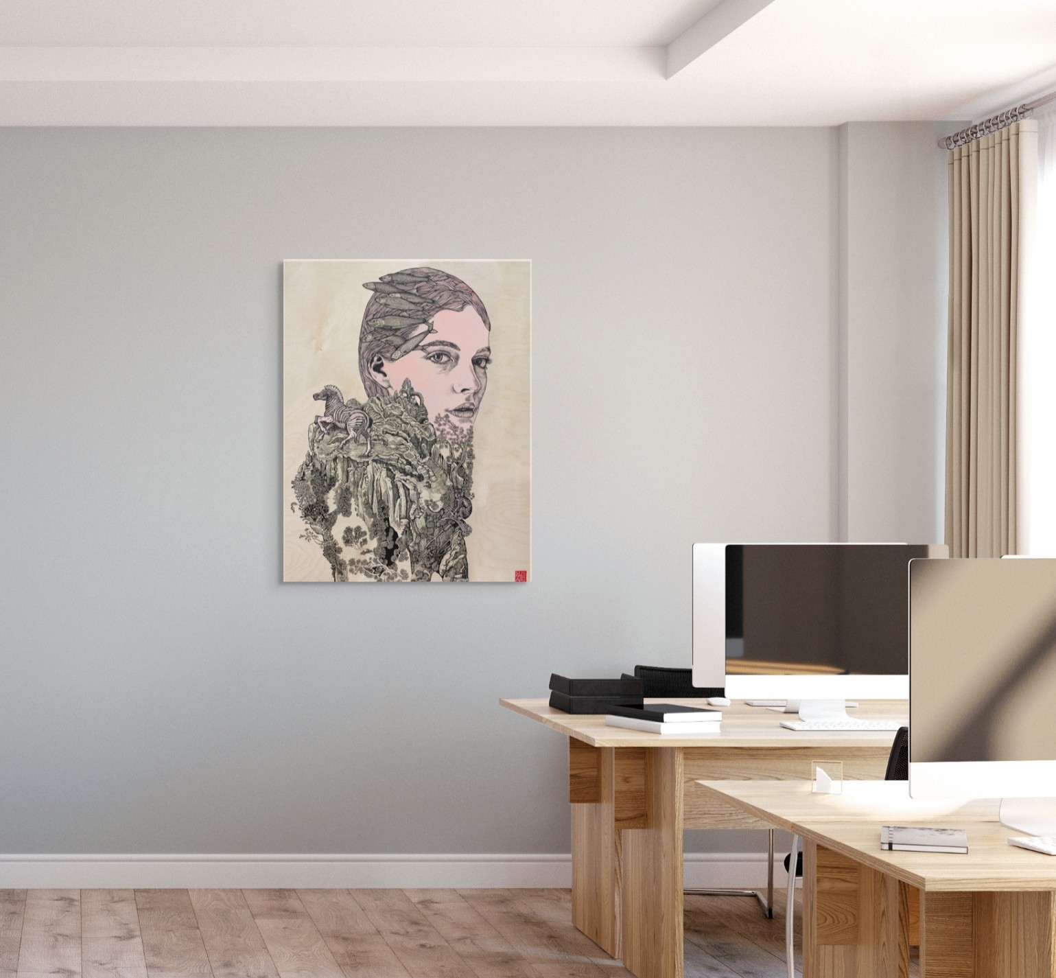 Œuvre originale de l'artiste Elia Pagliarino, explore la figure de Gaïa, la Terre-Mère, source de vie et de renouveau. L’alliance de l’acrylique et de l’encre de Chine crée un contraste saisissant entre fluidité et matière, entre ombre et lumière. Le bois de bouleau, support naturel, renforce l’ancrage de l’œuvre dans une symbolique organique, où l’énergie tellurique semble s’exprimer à travers chaque coup de pinceau.