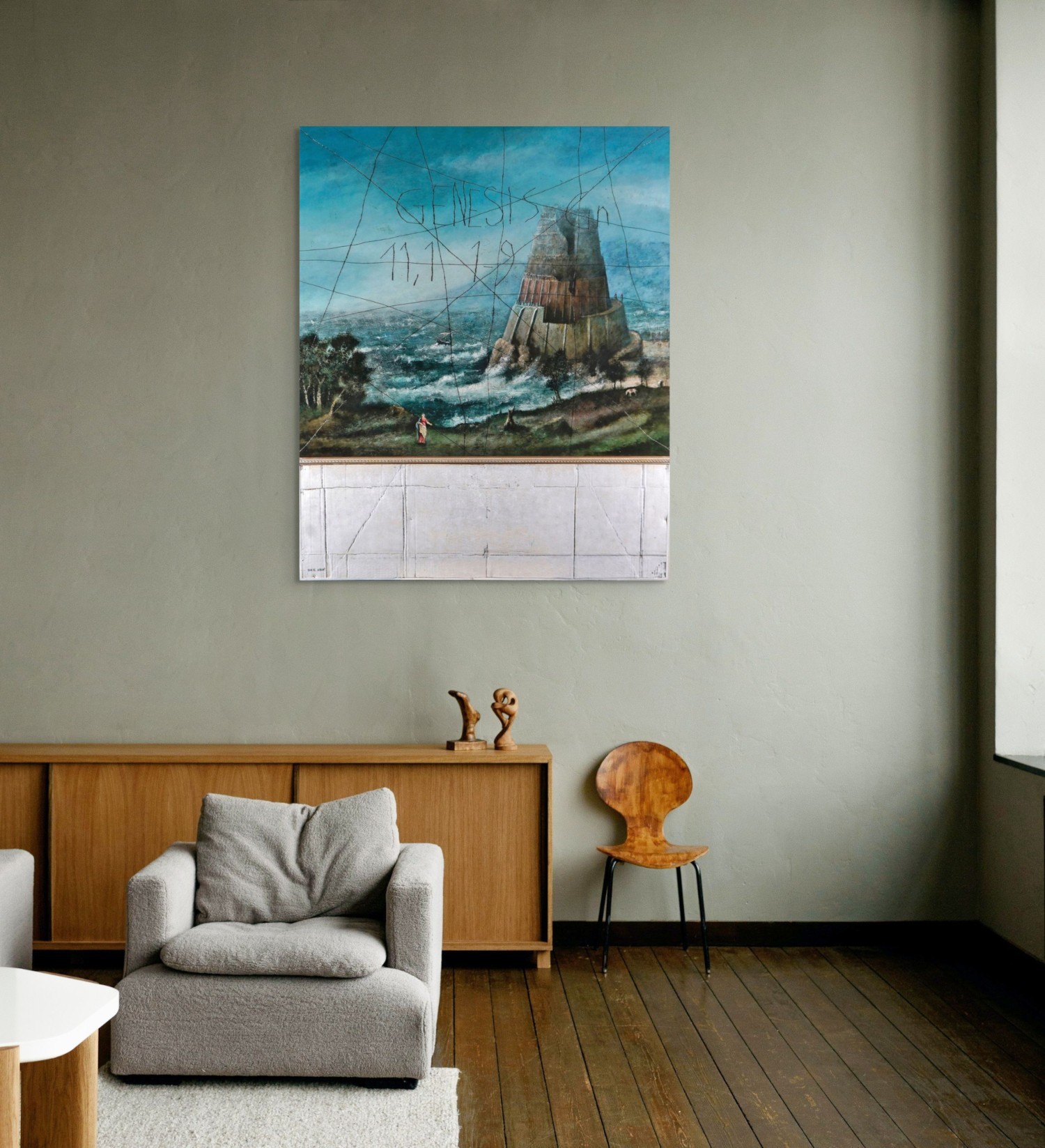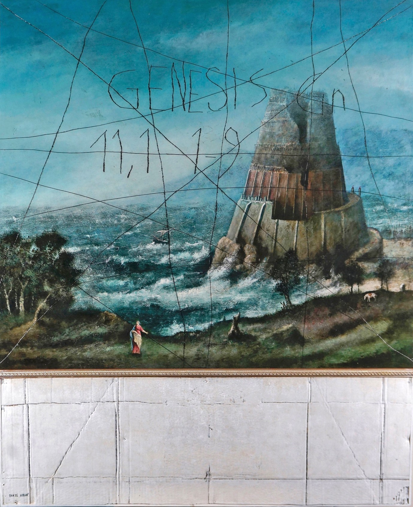 La partie supérieure, réaliste et dramatique, évoque un paysage de la Renaissance avec une tour imposante au bord d’une mer agitée. Des lignes noires fragmentées et l’inscription textuelle "GENESIS gn 11,1-9" rappellent le chaos et la division du récit biblique.