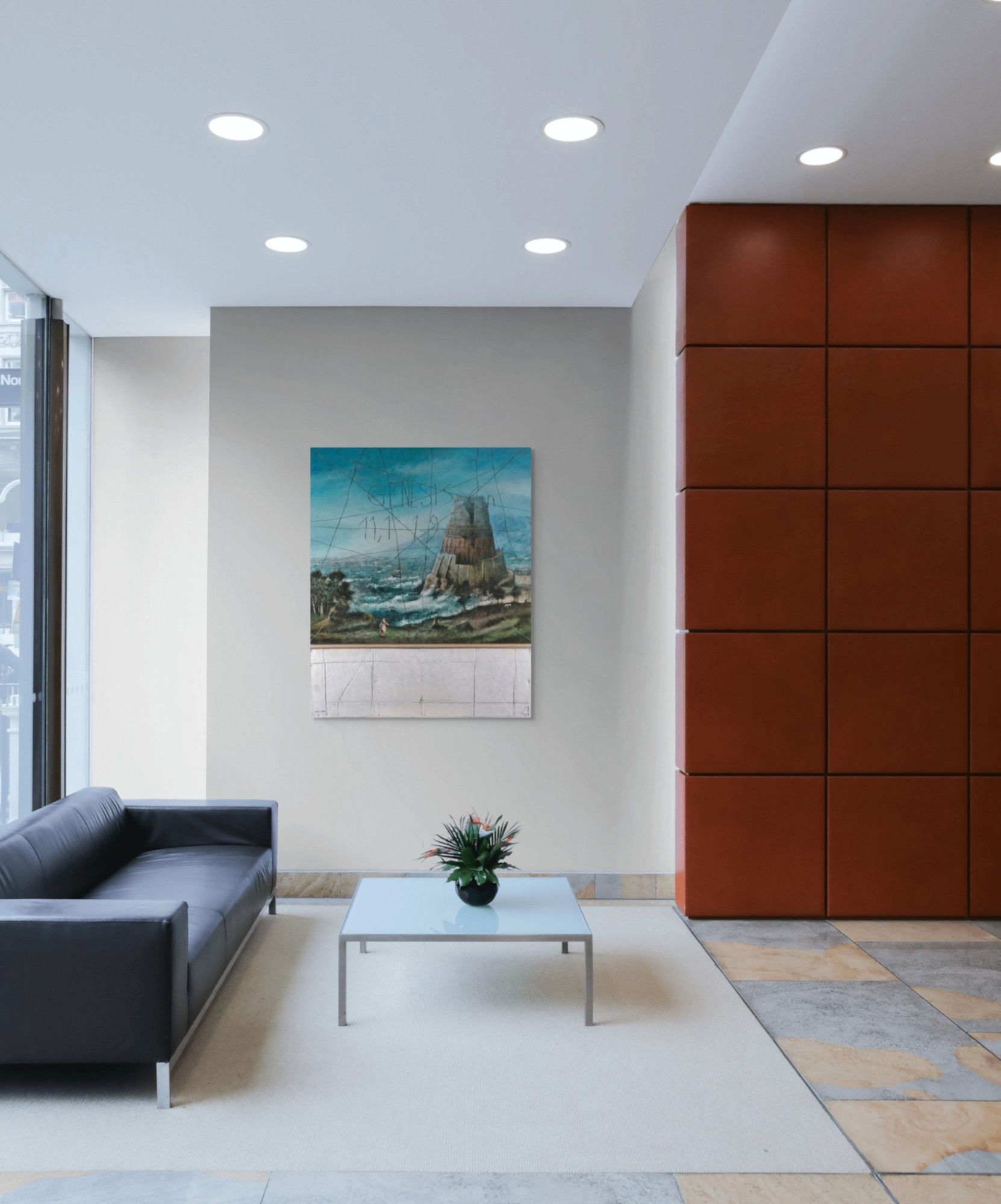 La partie inférieure, abstraite et minimaliste, introduit une esthétique contemporaine qui rompt avec le classicisme.Cette juxtaposition interroge la quête humaine d’unité face aux divisions linguistiques, culturelles et technologiques, tout en confrontant tradition et modernité dans un dialogue visuel puissant.