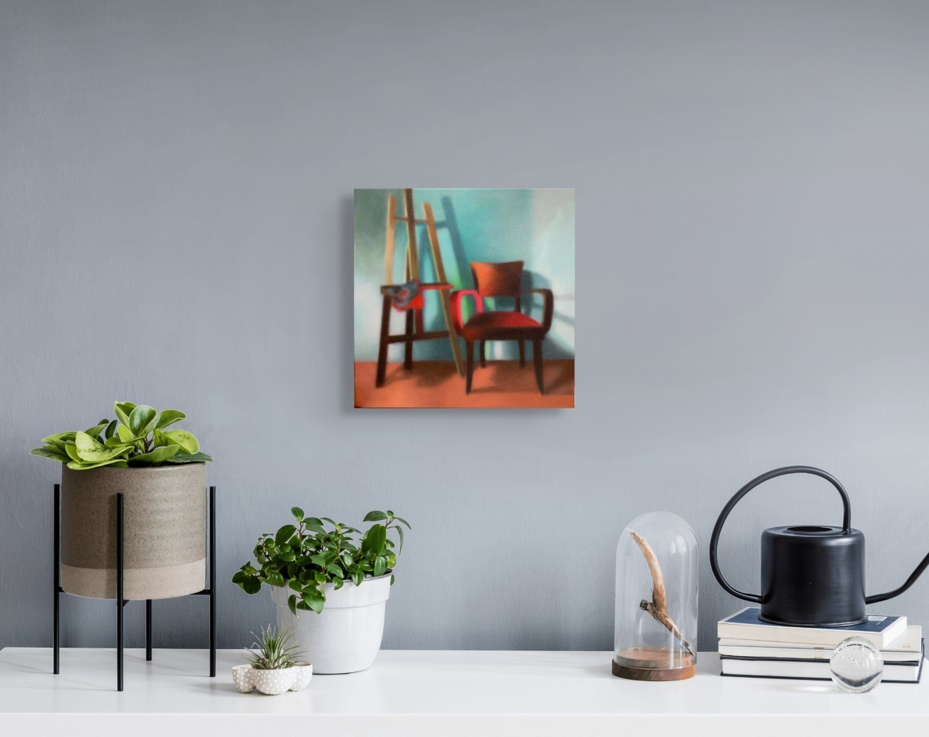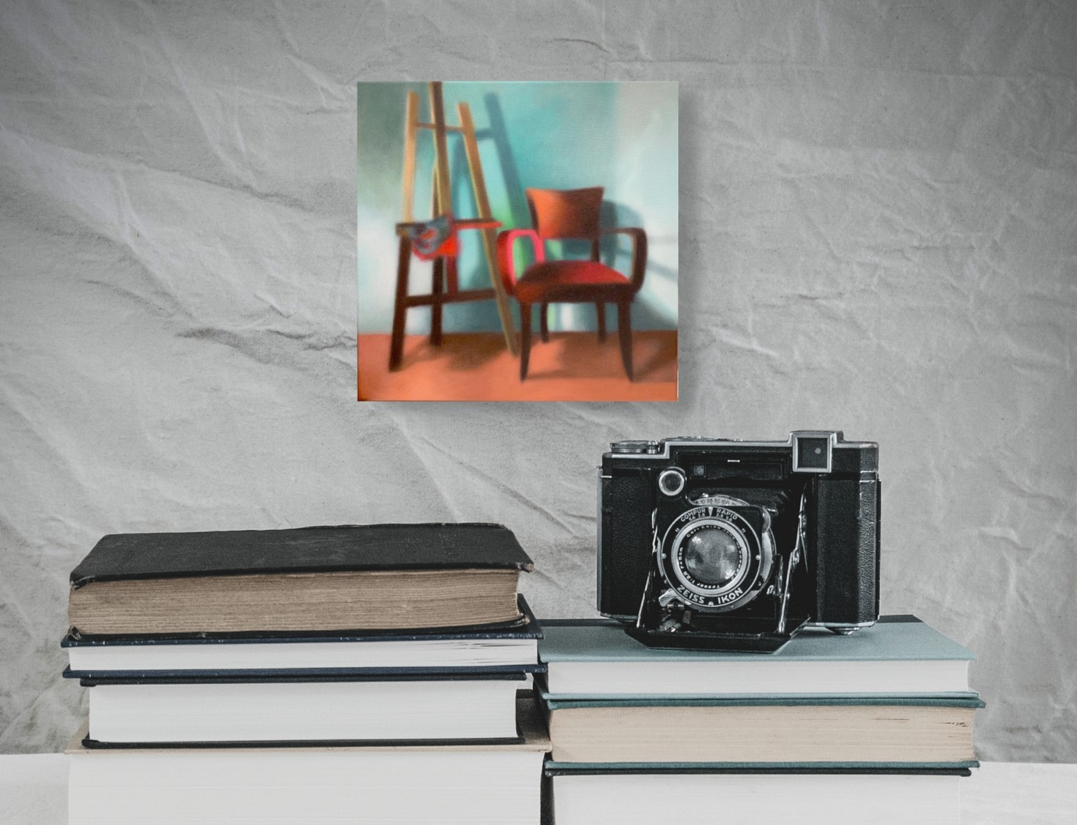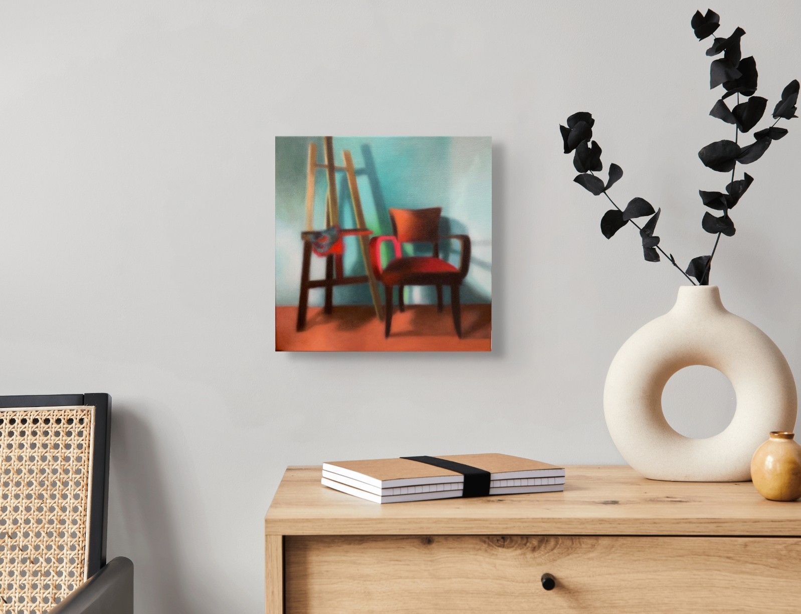 Œuvre originale de l'artiste Laëtitia Giraud, est une composition empreinte de mystère et de douceur, où la lumière et les ombres sculptent un espace figé dans le temps. Le flou pictural et les couleurs chaleureuses créent une atmosphère feutrée, presque nostalgique. Le chevalet et la chaise vides suggèrent une absence, une pause dans le processus créatif, laissant place à l’imagination du spectateur. Entre abstraction et réalisme, cette peinture invite à une réflexion sur la solitude, l’attente et l’acte artistique lui-même.