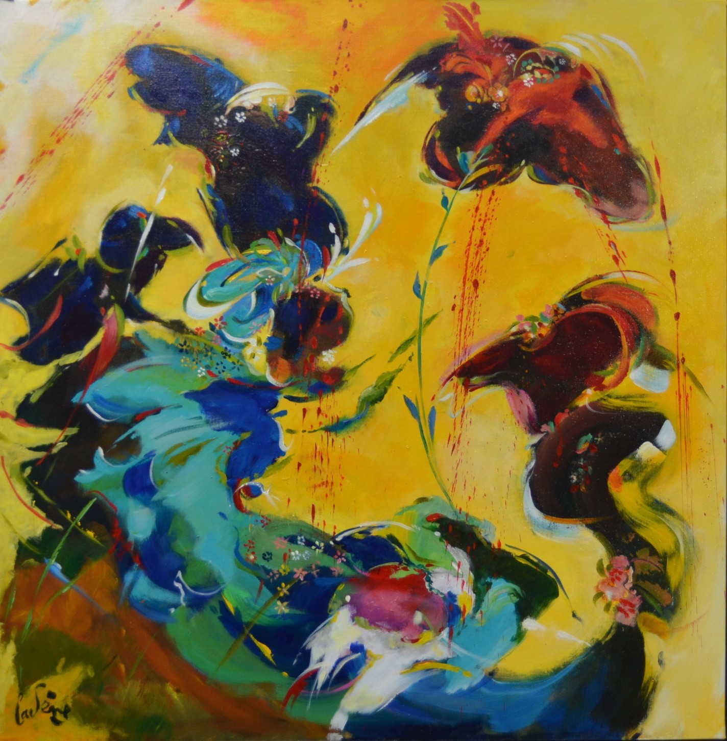 Œuvre originale de l'artiste Bernard CADENE, artiste peintre coloriste confirmée, à l'imaginaire foisonnant dans les entrelacs aux couleurs vives.