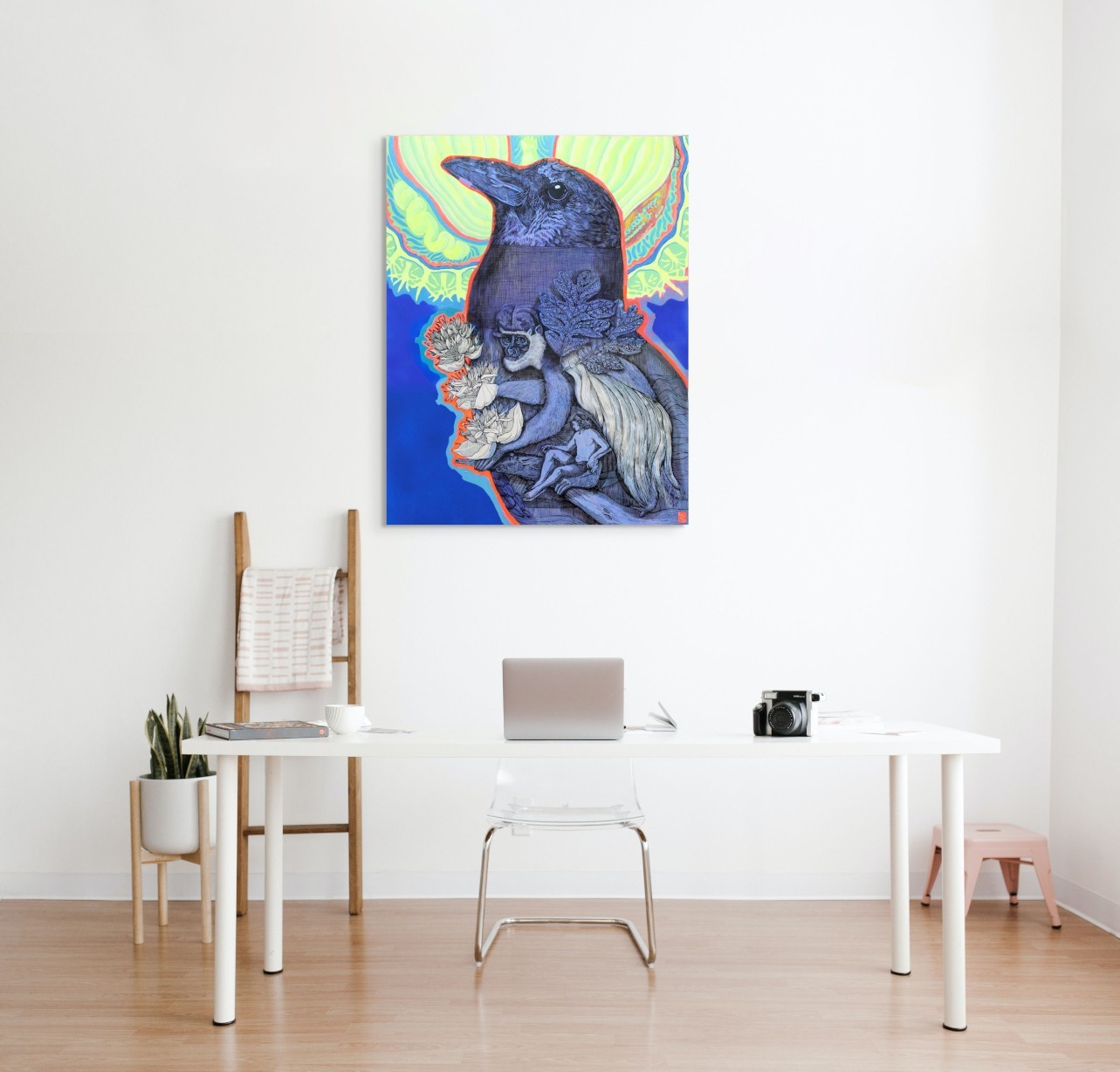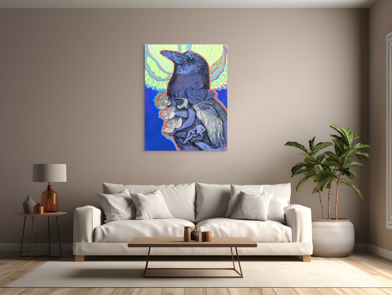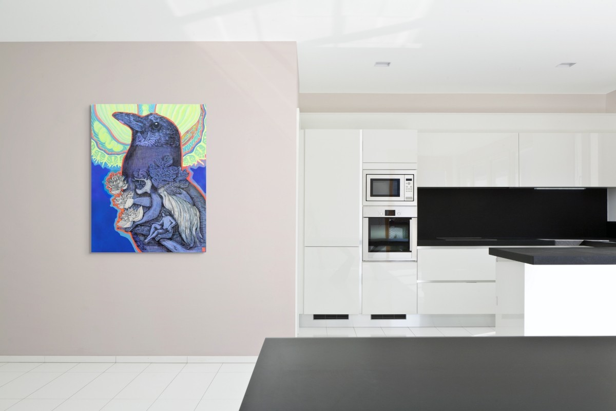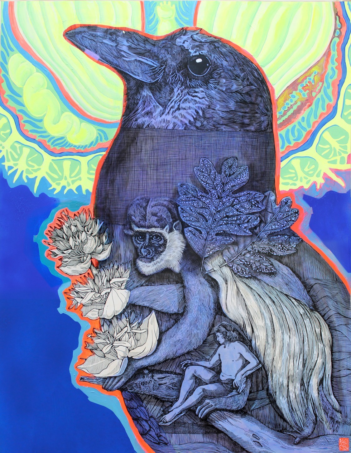 Œuvre originale de l'artiste Elia Pagliarino, présente une composition riche et symbolique. Un corbeau imposant domine la scène, encadré d’un halo lumineux évoquant une aura mystique. En son sein, un singe aux yeux perçants s’accroche à des branches ornées de fleurs de lotus, contrastant avec un homme nu, vulnérable, soutenu par une main géante. Les textures fines et les contrastes de bleu profond créent une atmosphère onirique où nature et humanité s’entrelacent dans une narration énigmatique.