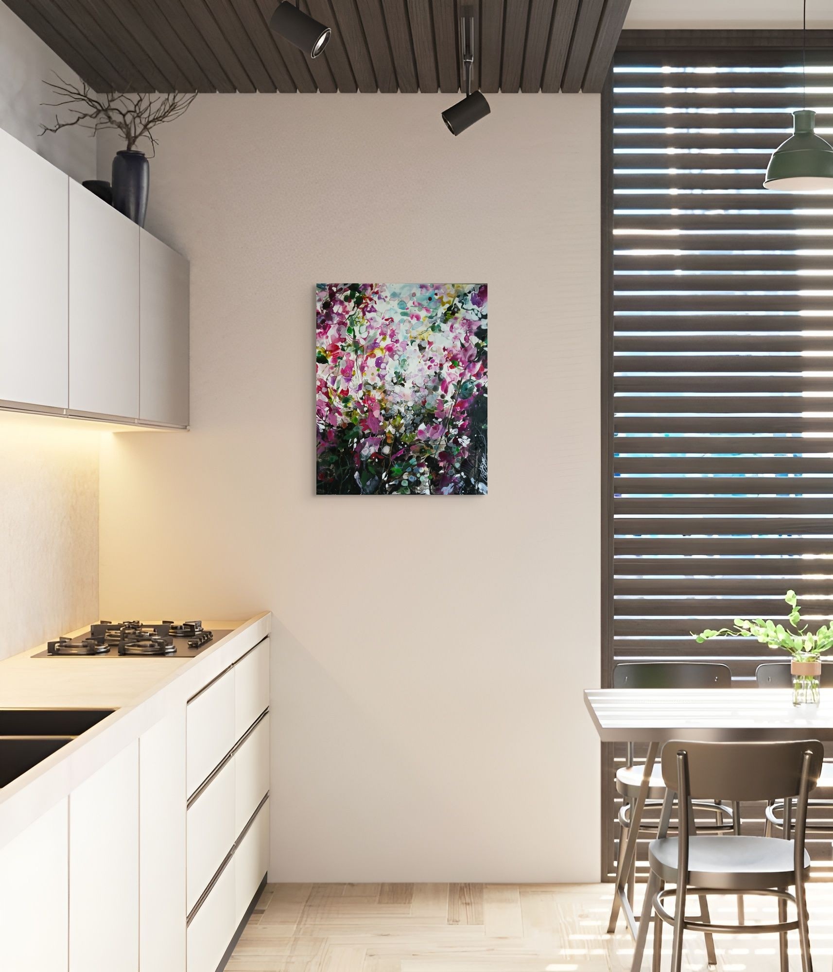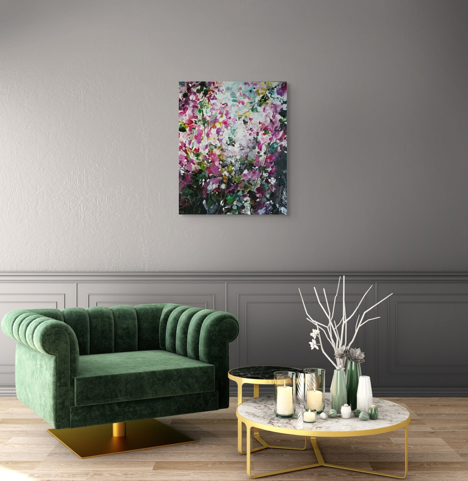 Œuvre originale de l'artiste BRESSAN CAROLE, une peinture abstraite et florale aux teintes dominantes de rose, vert et blanc. De multiples touches colorées et superpositions donnent une impression de nature en mouvement, évoquant un jardin luxuriant ou un paysage fleuri baigné de lumière. L’ensemble crée une atmosphère poétique et vibrante.