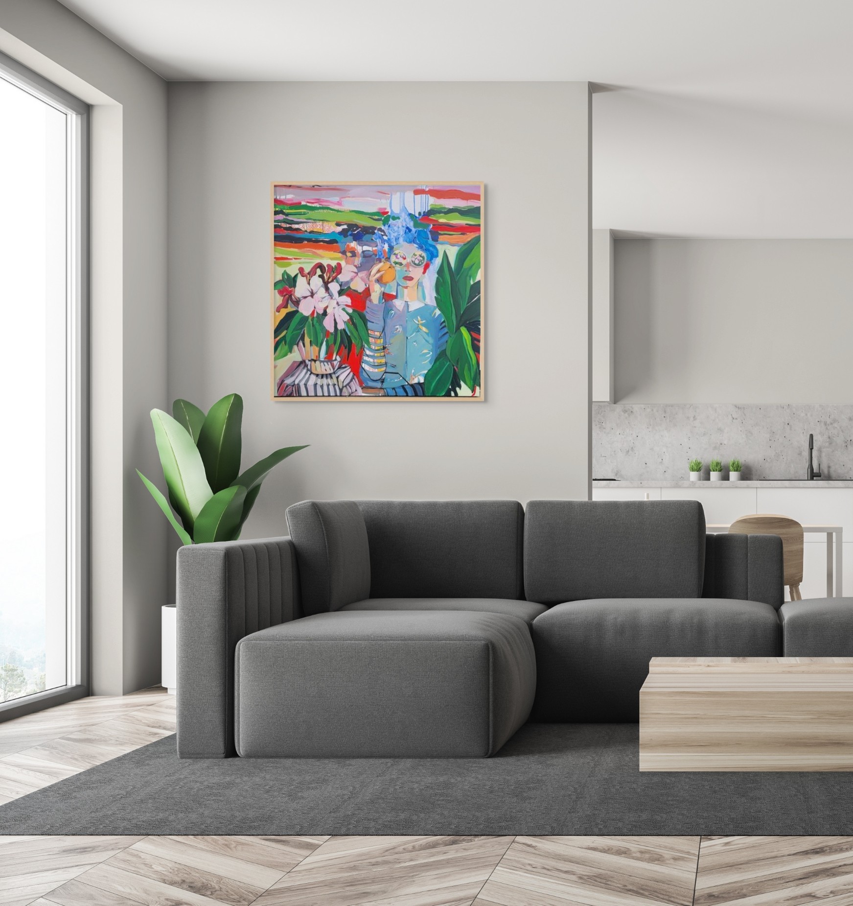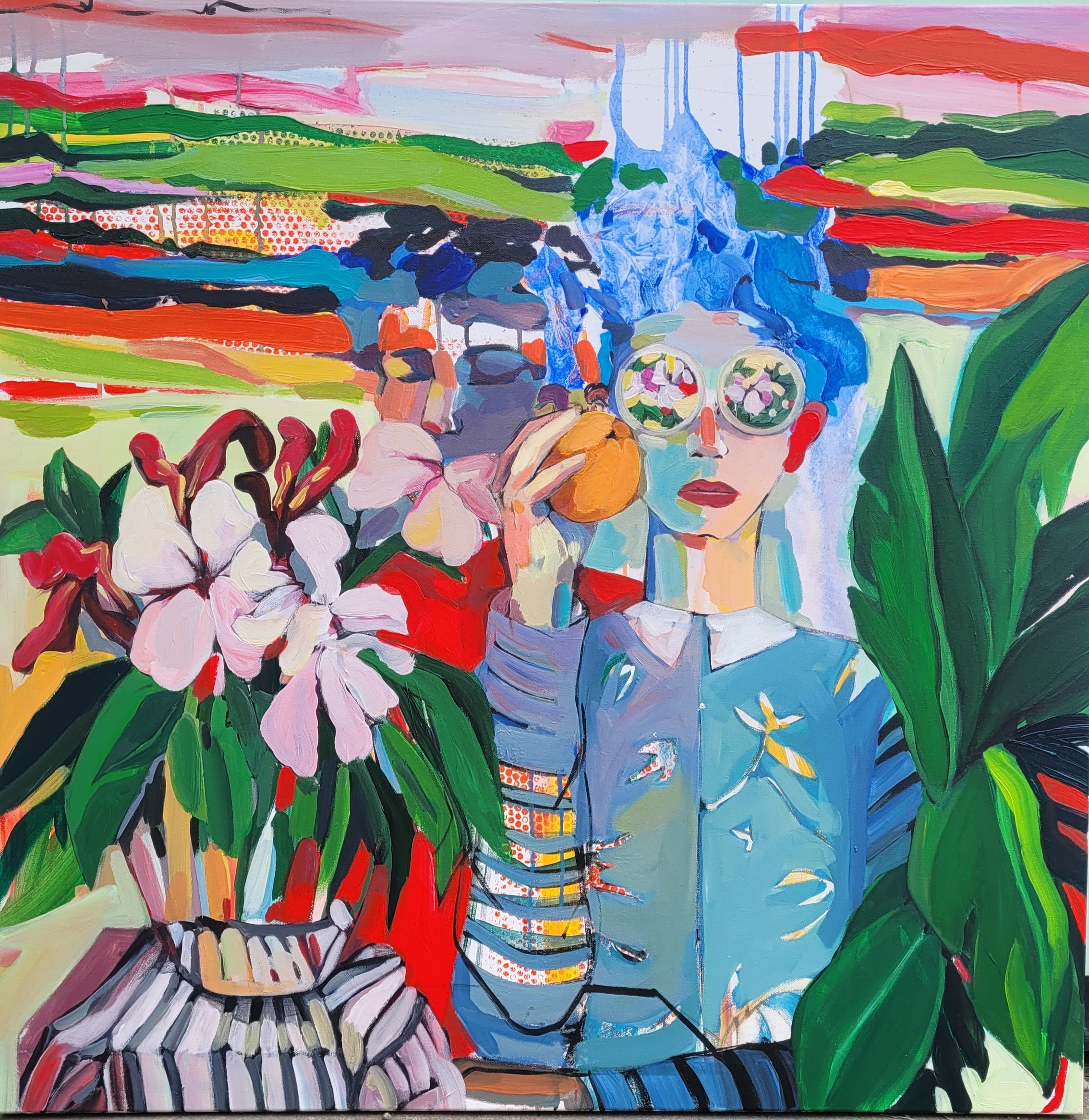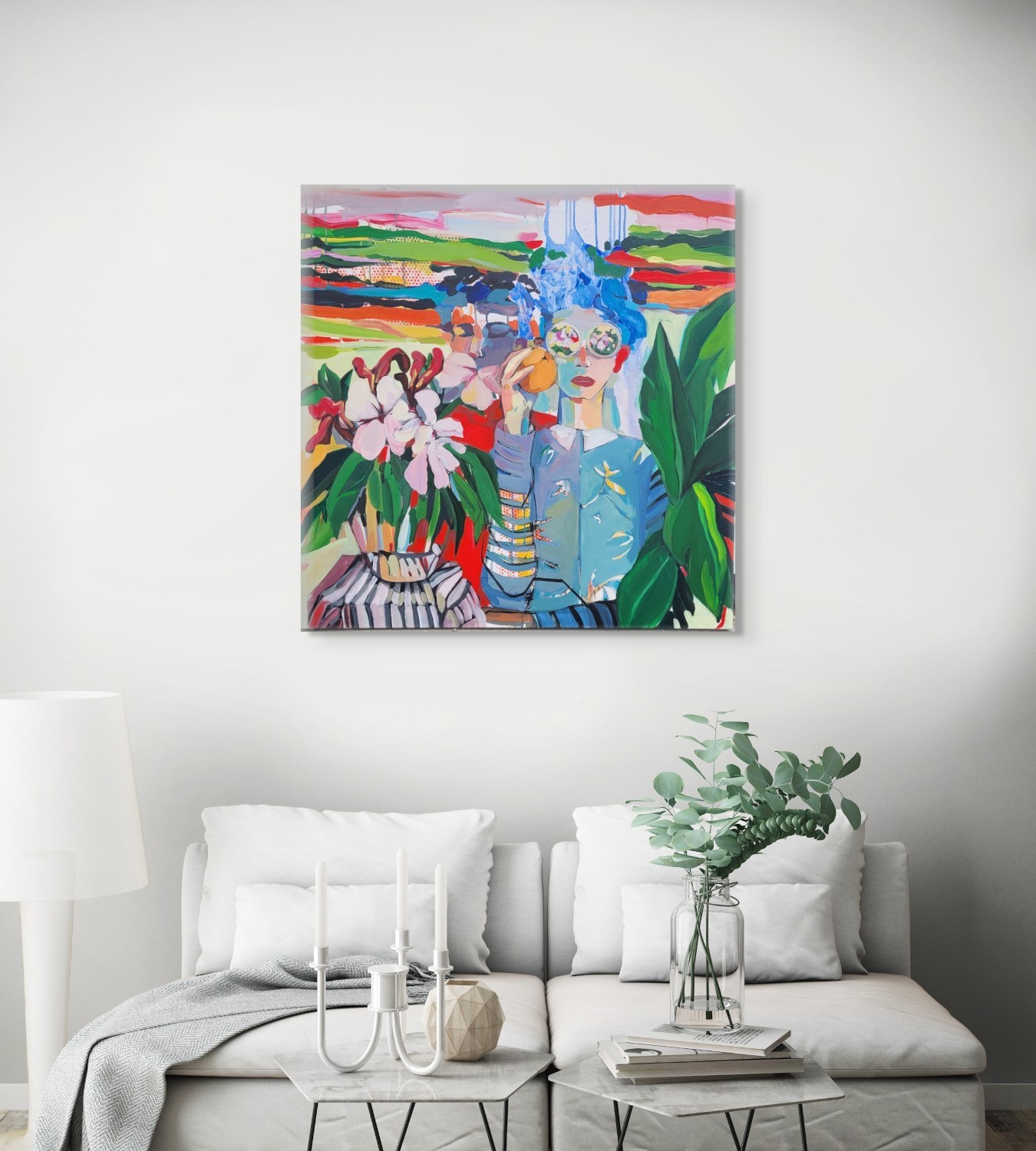 Œuvre originale de l'artiste GOLNAZ AFRAZ, qui se distingue par son style expressif et coloré, mêlant figures féminines, éléments naturels et textures dynamiques. Réalisée avec l'huile et acrylique sur toile, elle explore des thèmes comme l’identité, la liberté et la relation entre l’humain et son environnement.