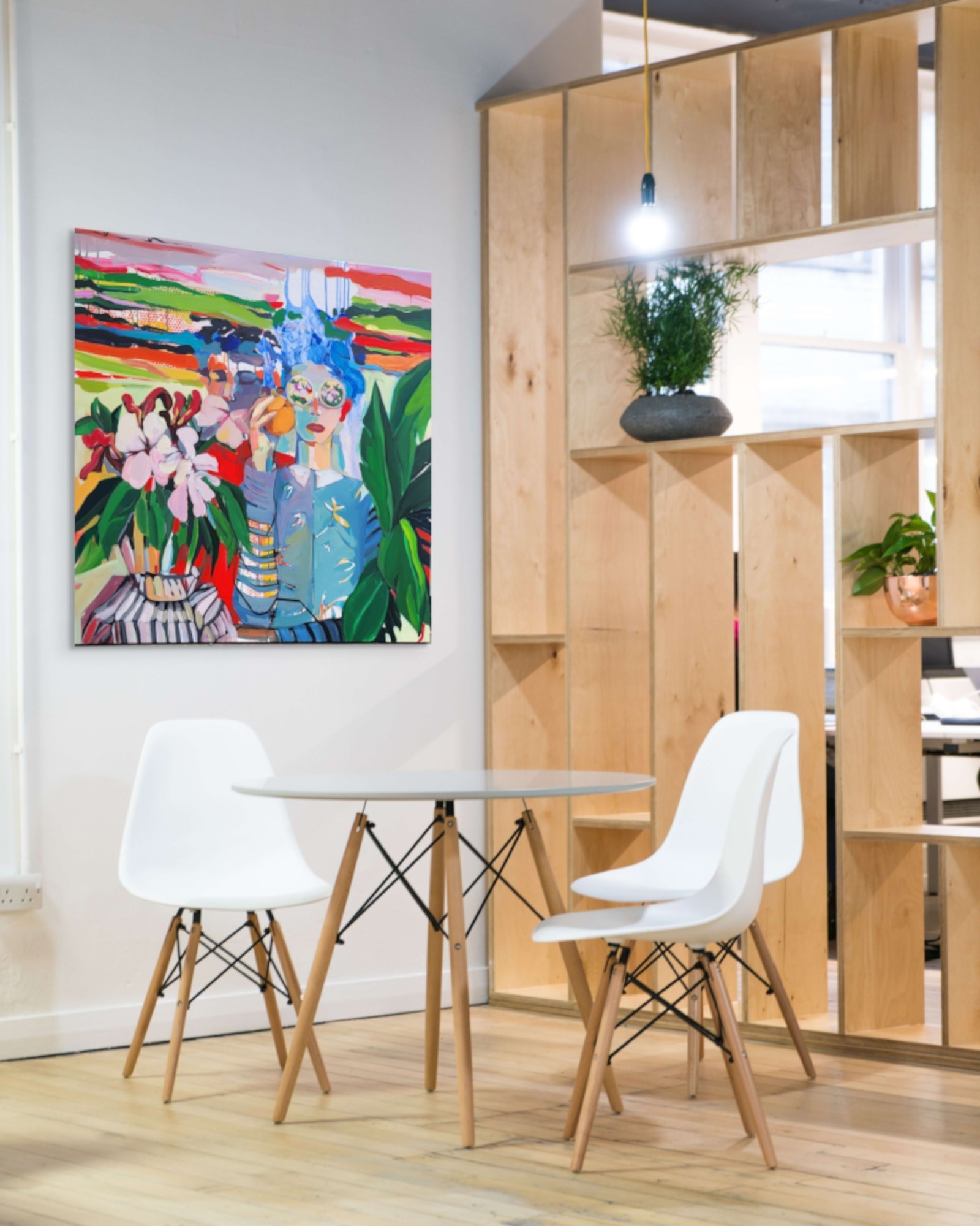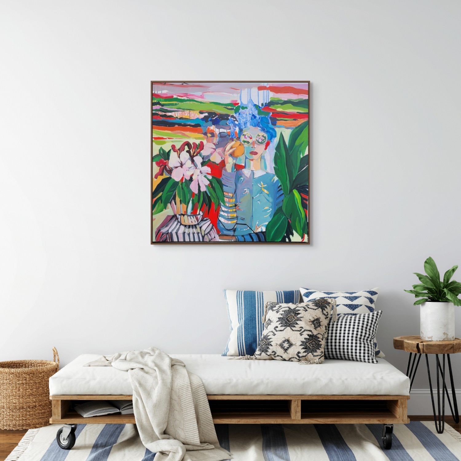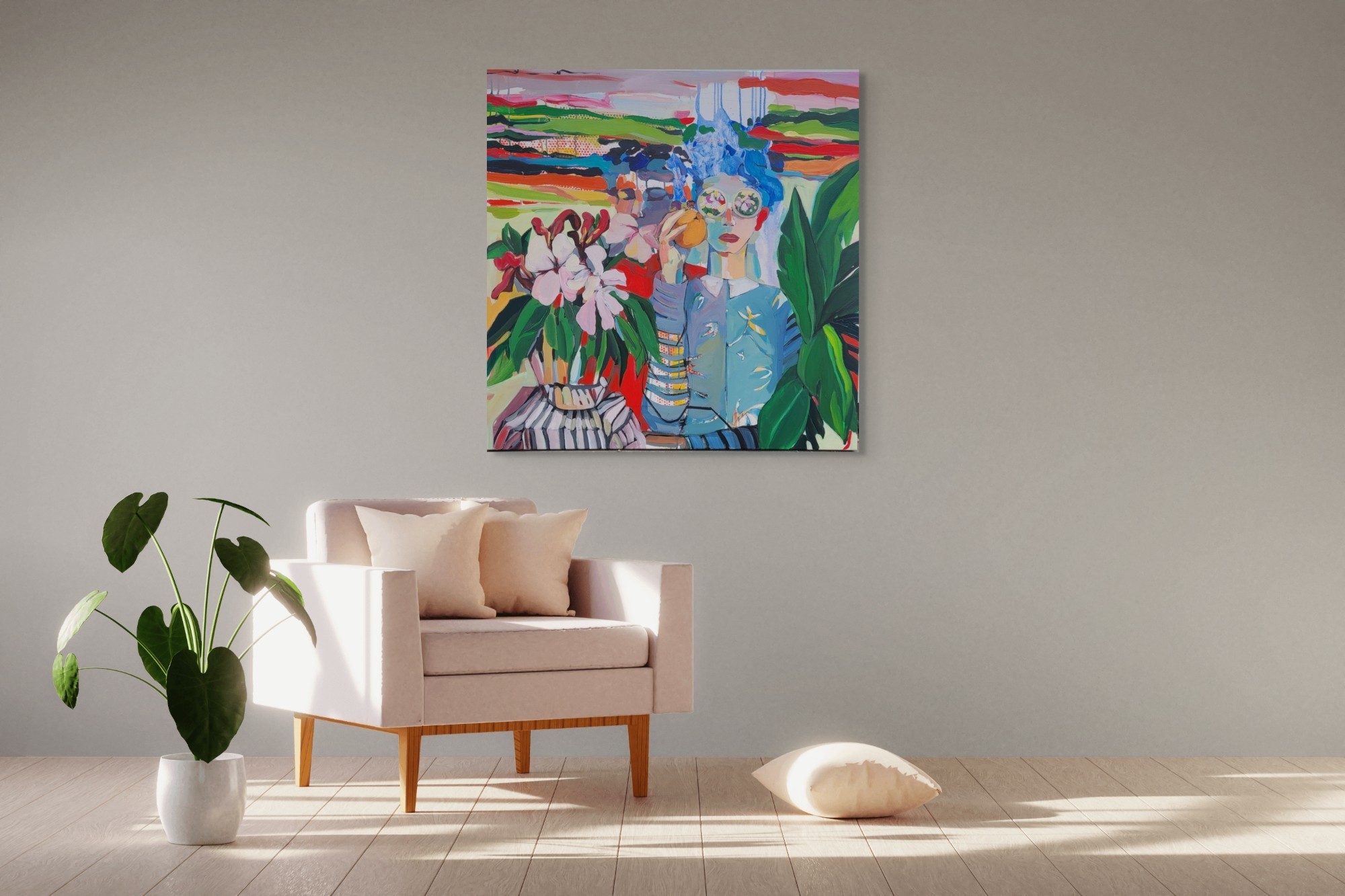 Œuvre originale de l'artiste GOLNAZ AFRAZ, qui se distingue par son style expressif et coloré, mêlant figures féminines, éléments naturels et textures dynamiques. Réalisée avec l'huile et acrylique sur toile, elle explore des thèmes comme l’identité, la liberté et la relation entre l’humain et son environnement.