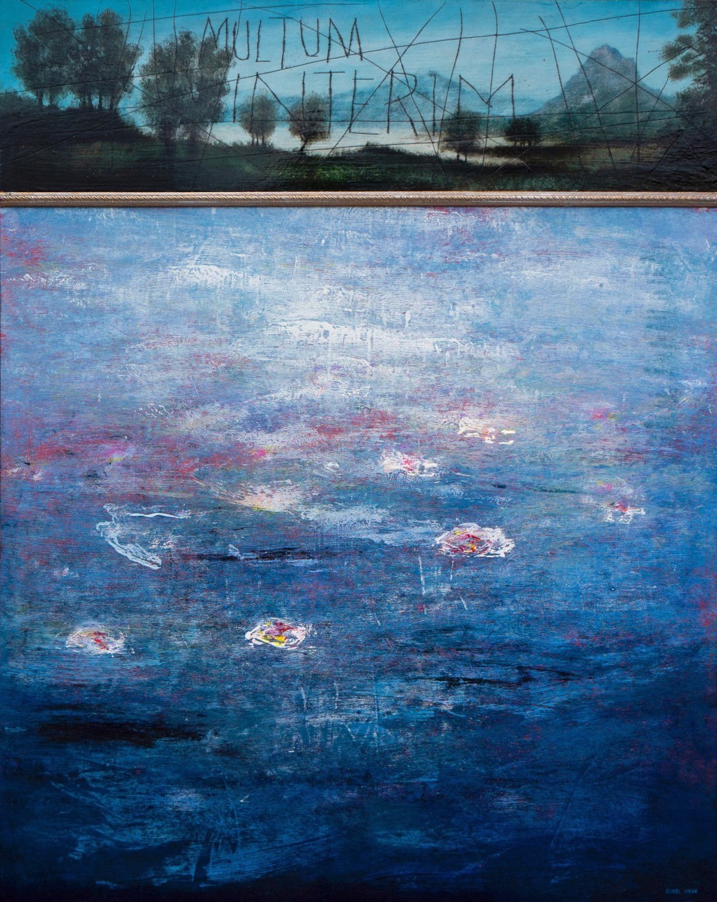 Cette œuvre juxtapose des éléments classiques et abstraits pour explorer la relation entre nature, temps et transformation. La partie supérieure représente un paysage paisible, rappelant les peintures romantiques, avec des arbres et une lumière douce, surmonté de l’inscription "MULTUM INTERIM", qui évoque l'idée de "beaucoup entre-temps", un intervalle riche en signification.