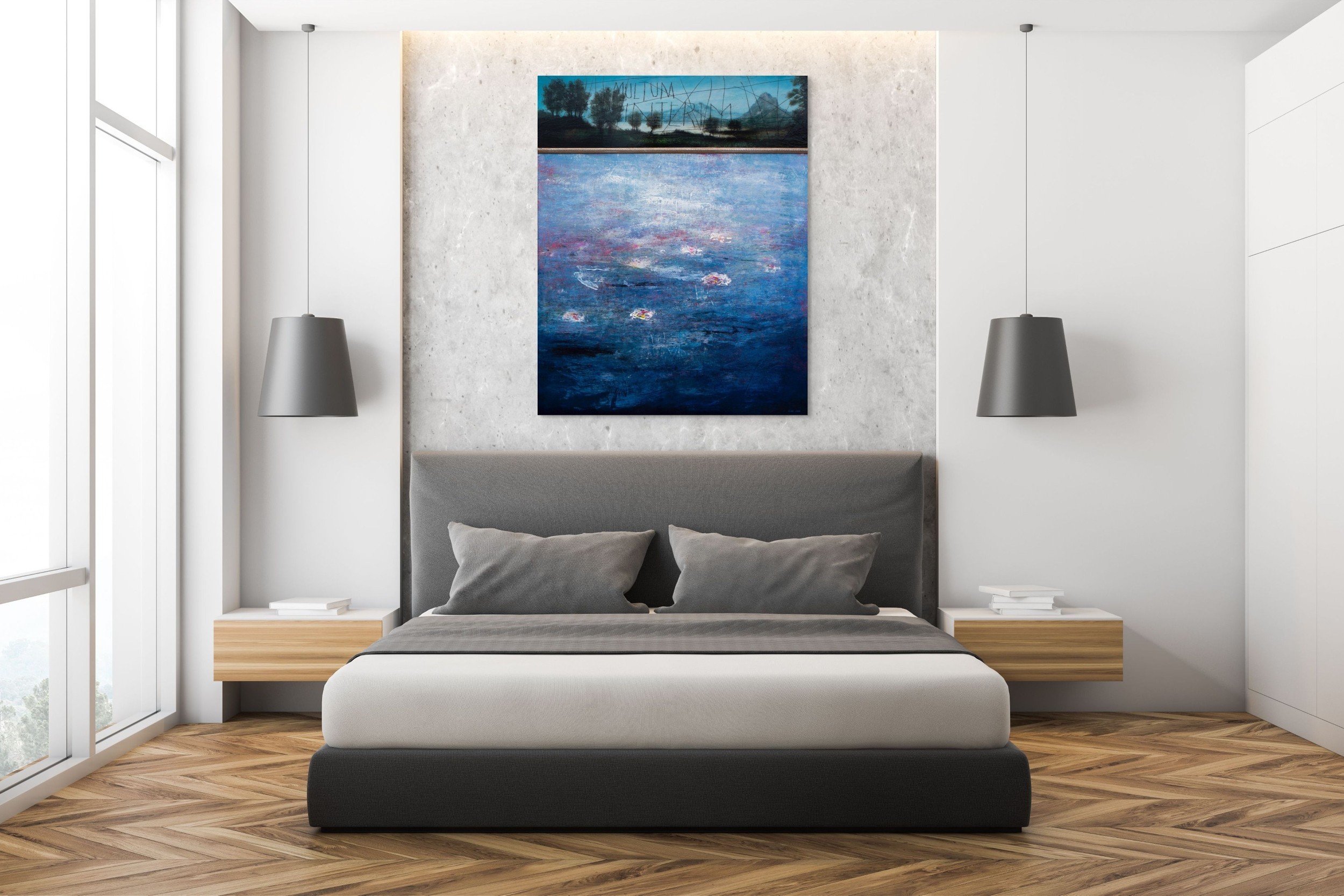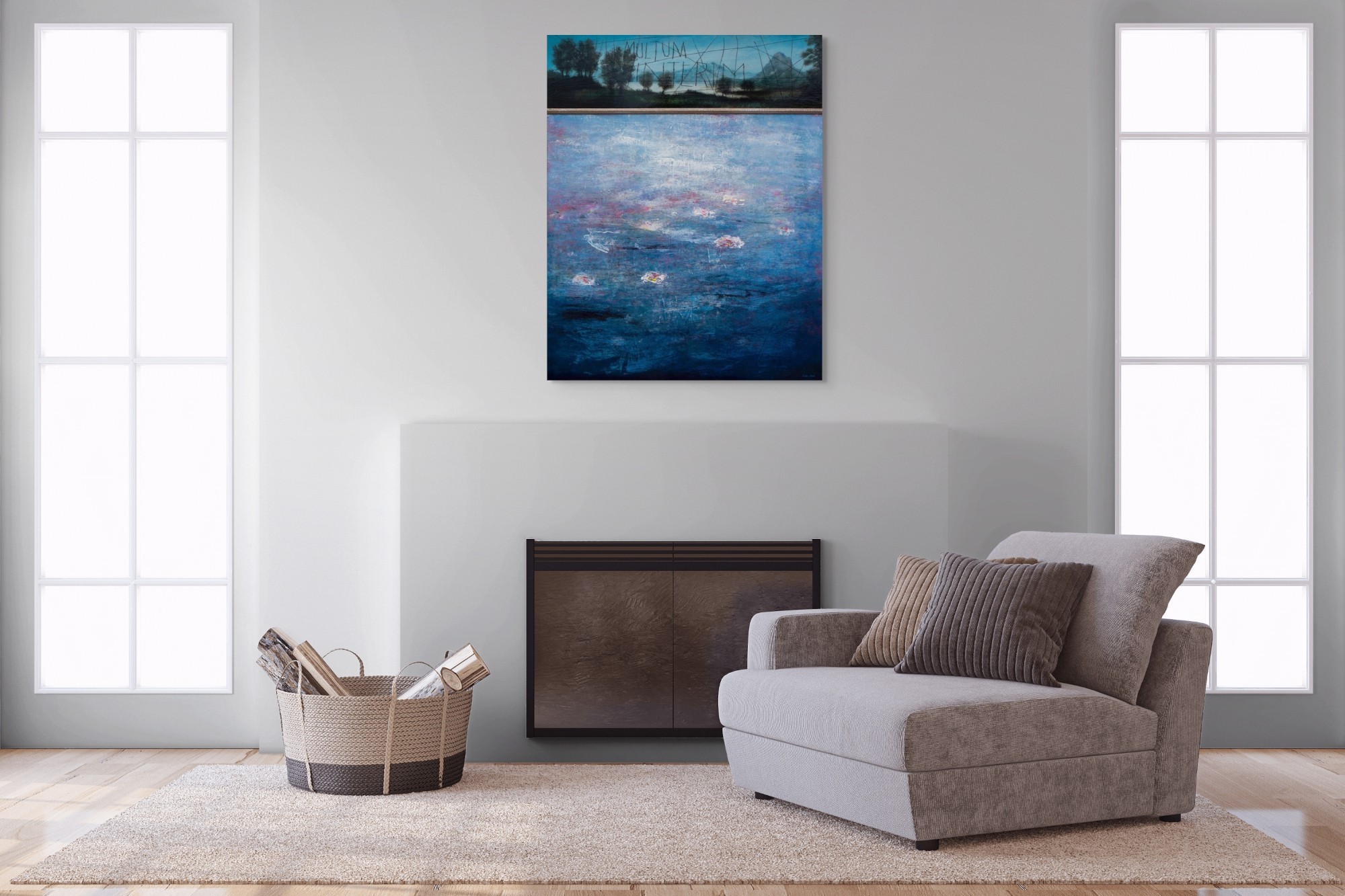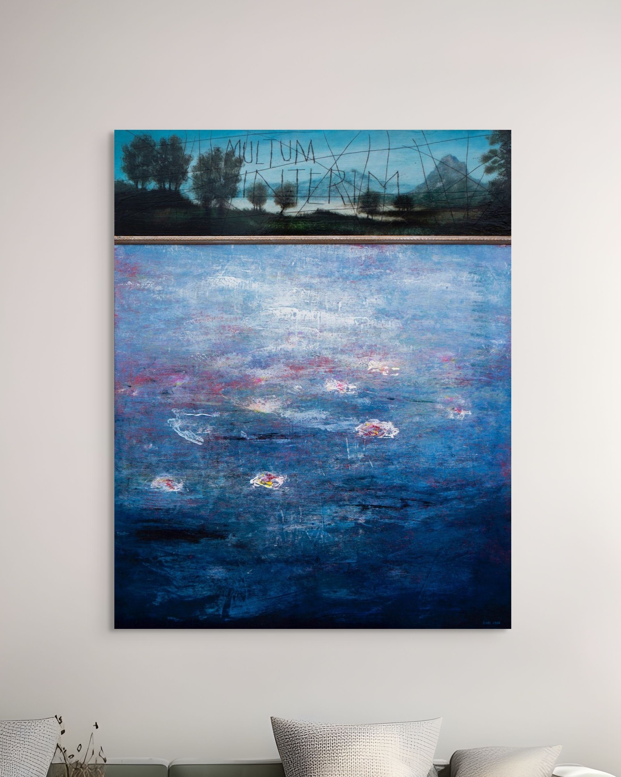 La partie inférieure, plus abstraite, présente une étendue d’eau bleue parsemée de touches de couleur évoquant des nénuphars. Cette abstraction rappelle l’influence de Monet tout en s’en détachant par une approche contemporaine. Le contraste entre le haut figuratif et le bas texturé invite à réfléchir sur le passage du temps, la mémoire et la dualité entre représentation et interprétation.
