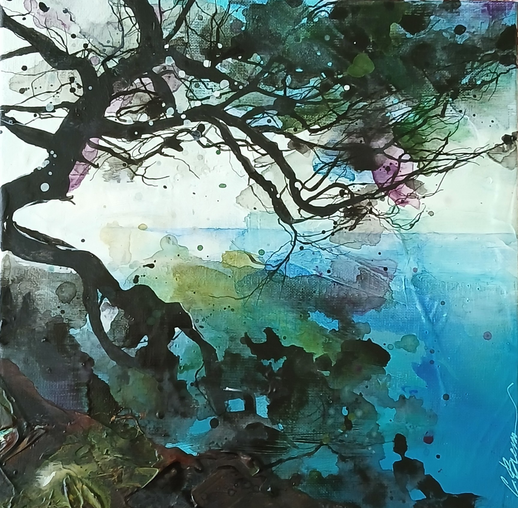 Œuvre originale de l'artiste BRESSAN CAROLE, un arbre sombre se détache sur un fond aux teintes bleues et vertes, mêlant encres fluides et gestuelle libre pour exprimer une vision poétique, mystérieuse et émotive de la nature.