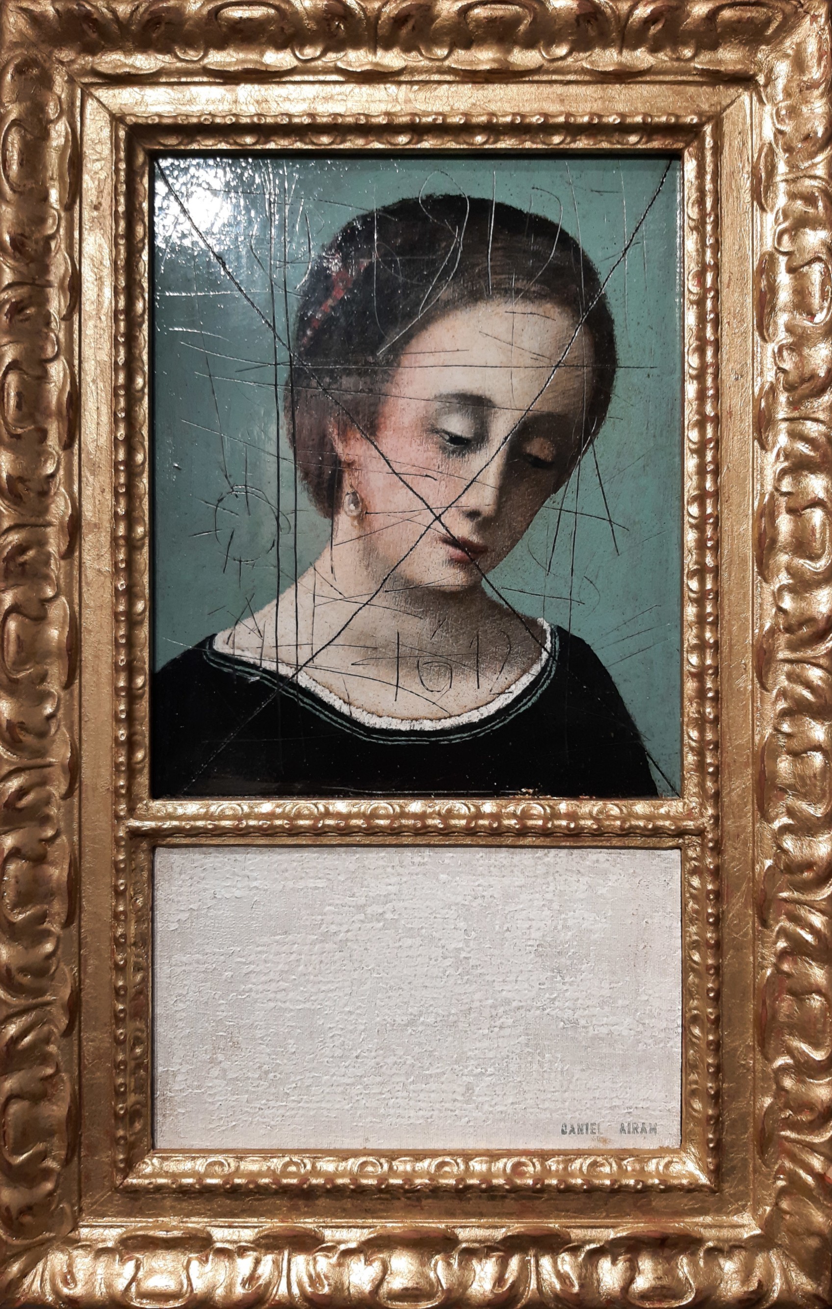 Le cadre doré, richement orné, encadre l'ensemble, renforçant le dialogue entre le classicisme du portrait et les interventions modernes de l'artiste. Cette juxtaposition invite à réfléchir sur la coexistence de l'ancien et du nouveau, et sur la manière dont les techniques contemporaines peuvent réinterpréter des thèmes artistiques intemporels.