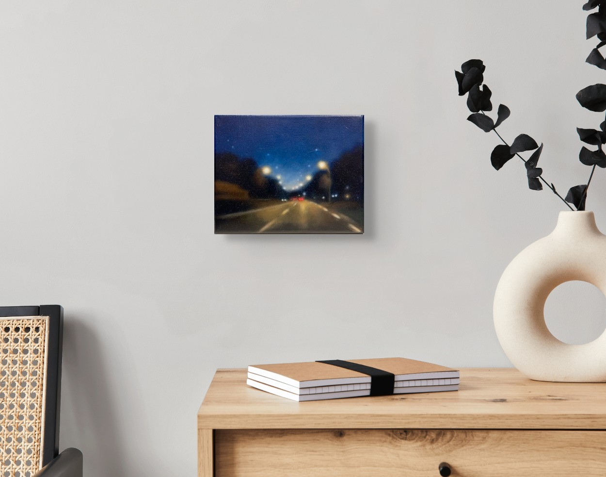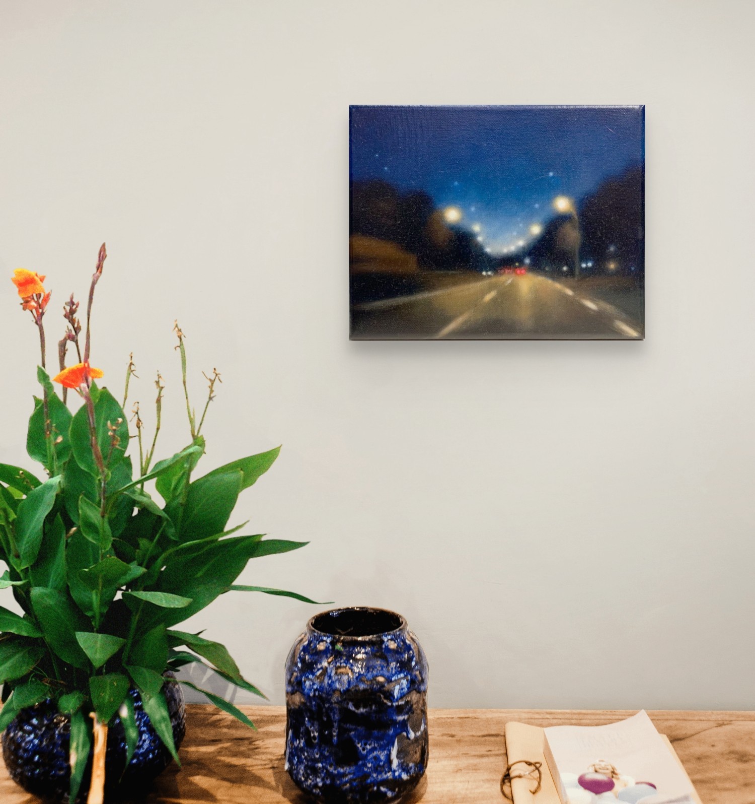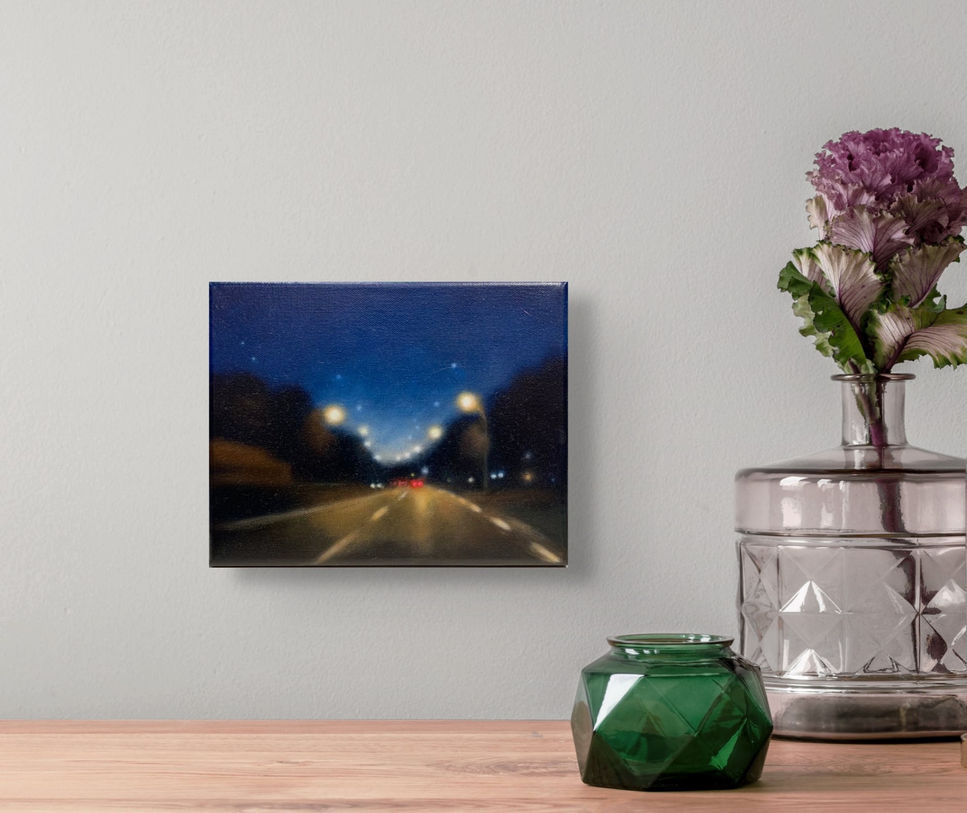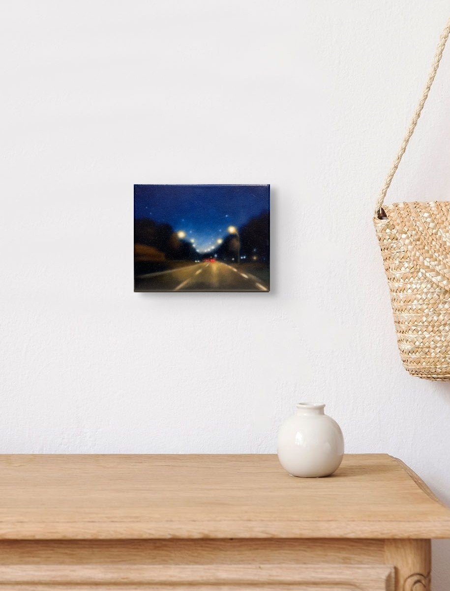 Œuvre originale de l'artiste Laëtitia Giraud, est une plongée dans l’univers urbain de la nuit, où la lumière devient le fil conducteur de l’émotion. Les néons vibrants, les phares éclatants et les reflets sur le bitume créent une atmosphère cinématographique, entre solitude et fascination. Par un jeu subtil de contrastes et de couleurs, cette peinture capte l’essence des paysages nocturnes et invite à une contemplation silencieuse.