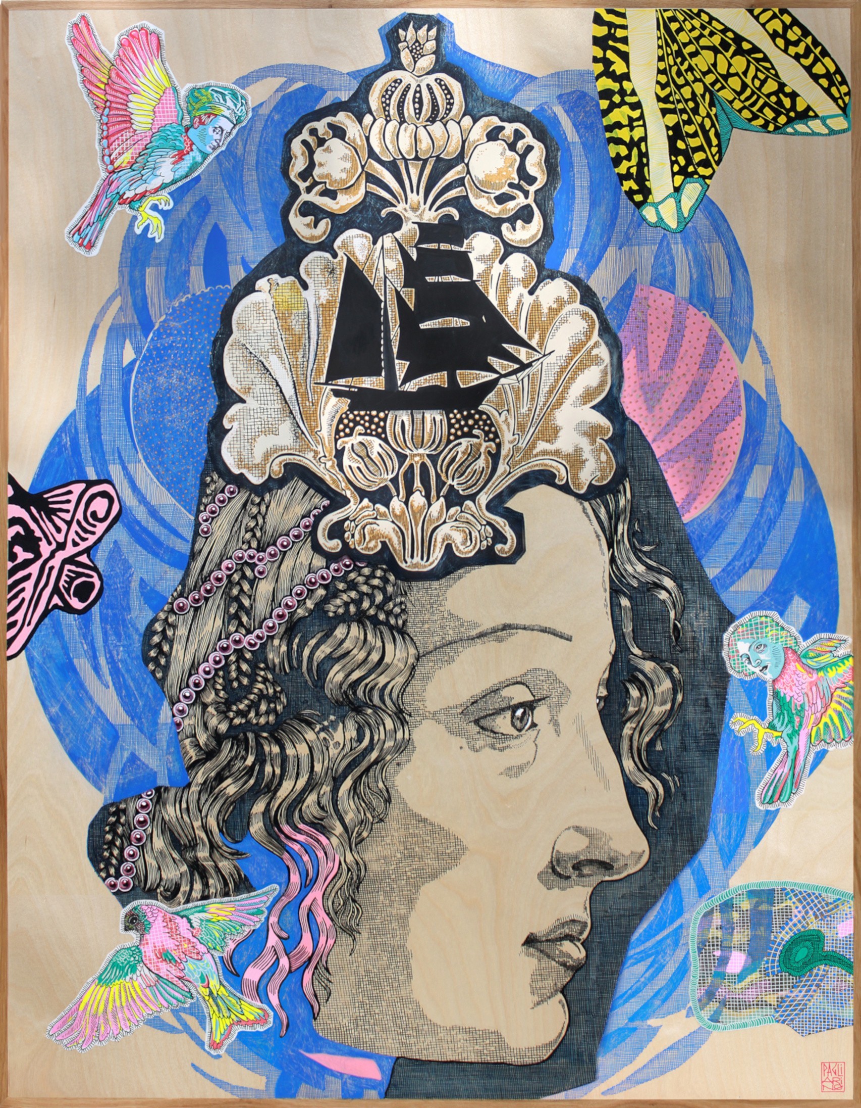 Œuvre originale de l'artiste Elia Pagliarino,rend hommage à Simonetta Vespucci, muse de la Renaissance, en illustrant son lien avec Sandro Botticelli, qui l’a admirée et représentée, et Amerigo Vespucci, son parent par alliance.