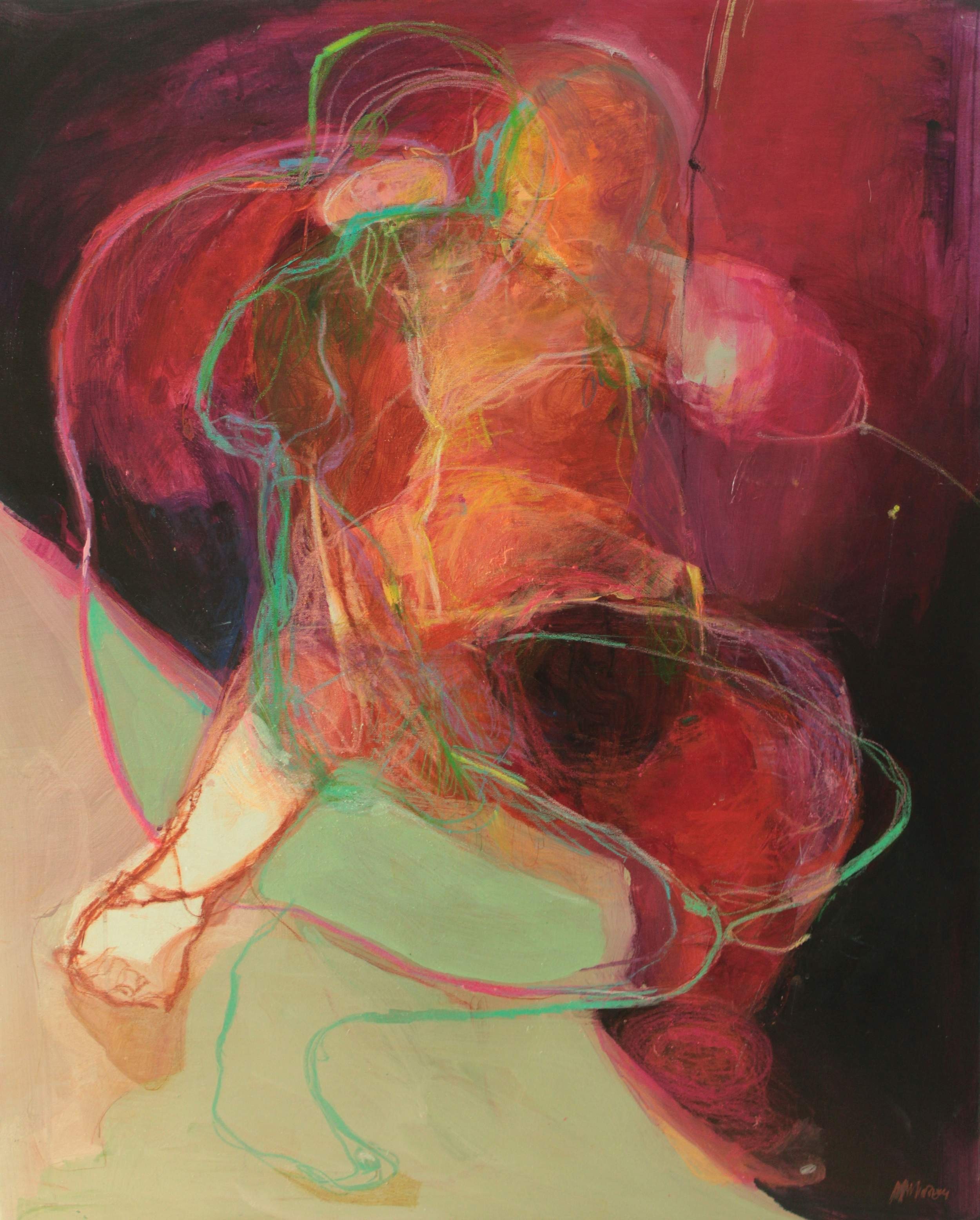 Œuvre originale de l'artisteMagdalena Morey, montre des formes fluides et colorées qui évoquent des émotions intenses mêlées à une sensation de calme intérieur. Les fils verts symbolisent la sérénité au cœur de cette expression abstraite et vibrante.