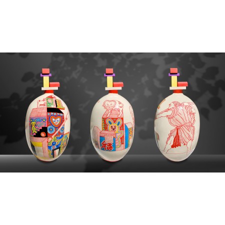 Céramique originale de l'artiste Elia Pagliarino, dont le travail est souvent caractérisé par des formes au caractère ethnique ou rétro. Son intérêt pour l'anthropologie et les représentations venues d'Océanie donne un caractère tout à fait singulier à ses figurations imaginaires.