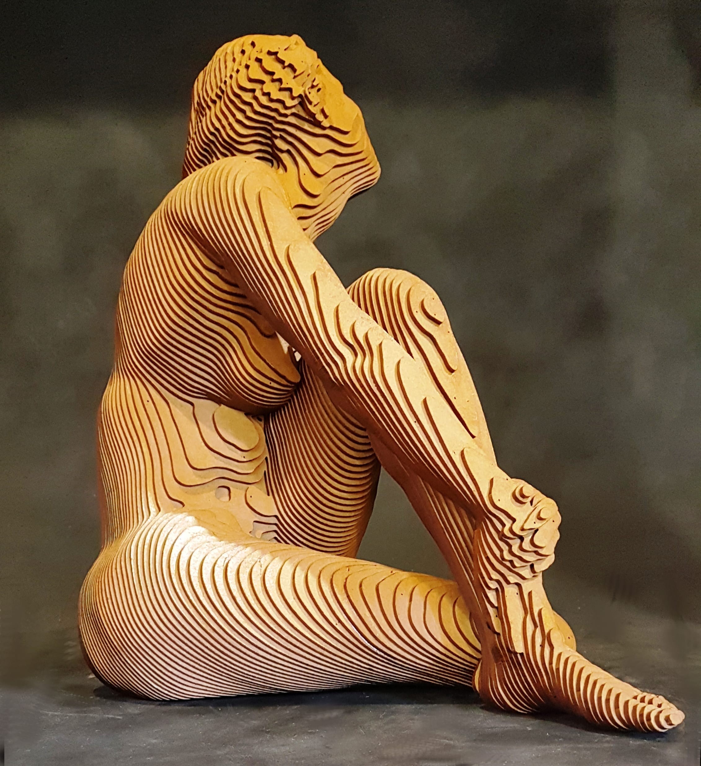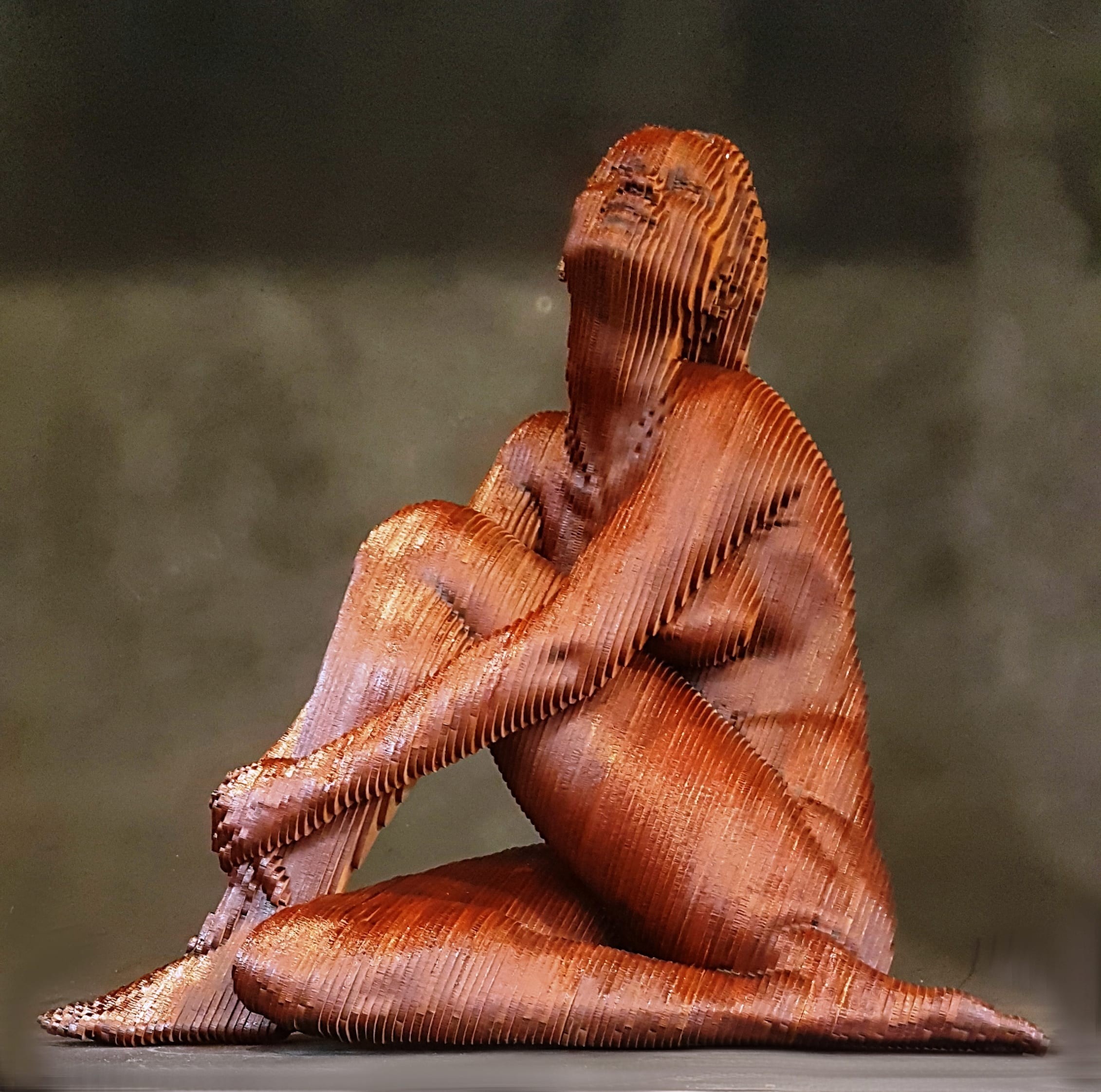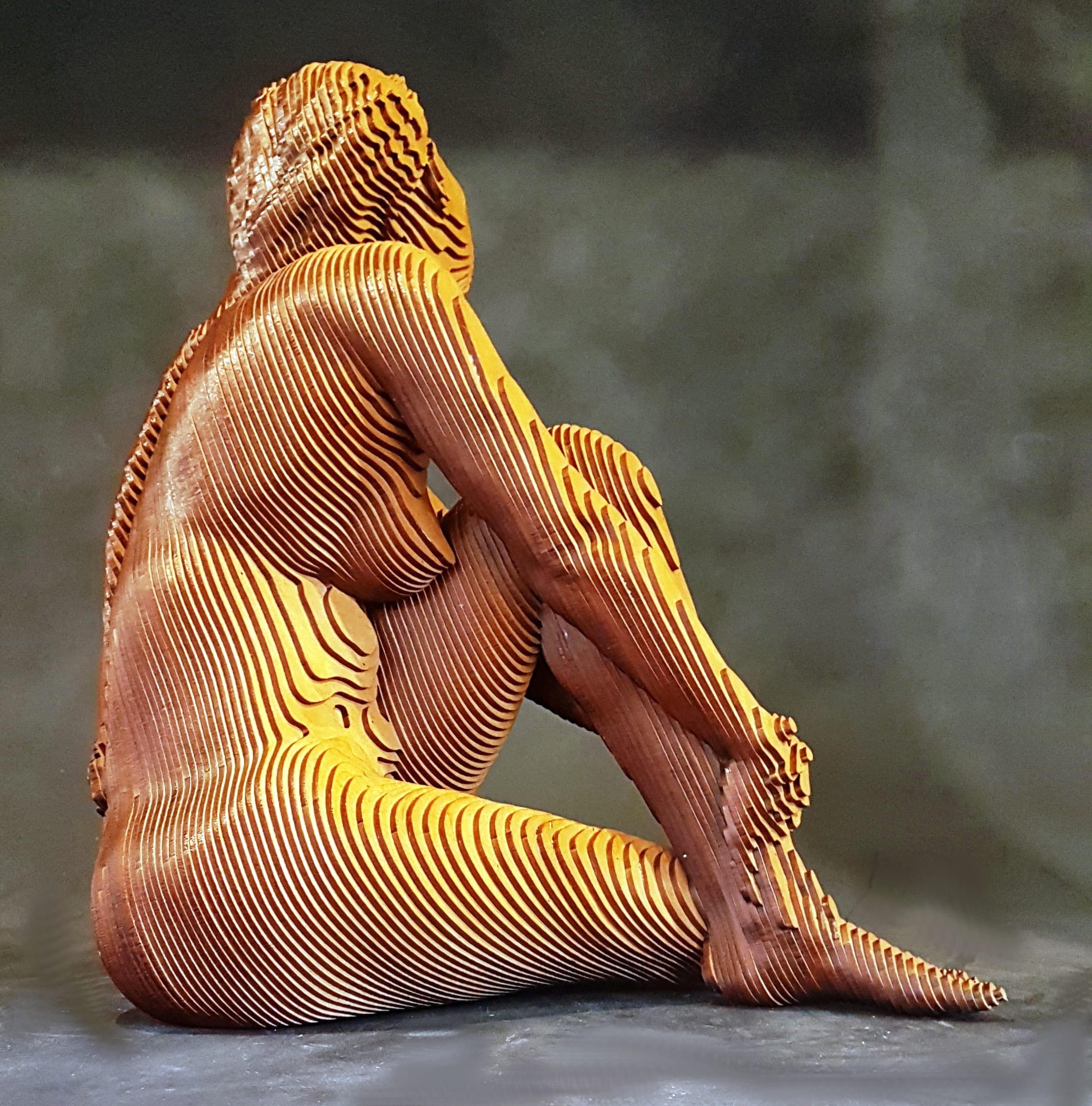 Œuvre originale de l'artiste Olivier Duhamel, illustre sa technique du lamellé-collé, créant une silhouette tridimensionnelle jouant avec la lumière. Ses reflets lui donnent une apparence holographique, accentuant la fluidité et la sensualité du corps humain. L’œuvre témoigne de sa maîtrise de la forme et de son approche artistique unique.