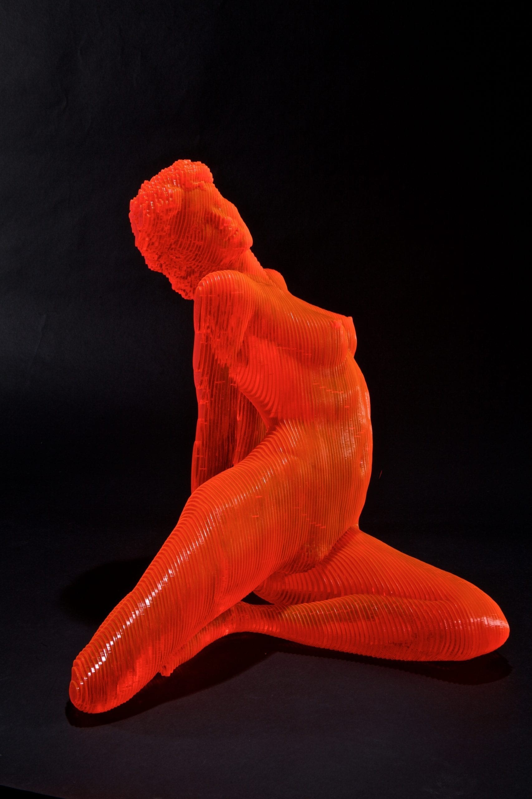 Œuvre originale de l'artiste Olivier Duhamel, illustre sa technique du lamellé-collé, créant une silhouette tridimensionnelle jouant avec la lumière. Ses reflets oranges et rouges lui donnent une apparence holographique, accentuant la fluidité et la sensualité du corps humain. Alliant innovation et tradition, l’œuvre témoigne de sa maîtrise de la forme et de son approche artistique unique.