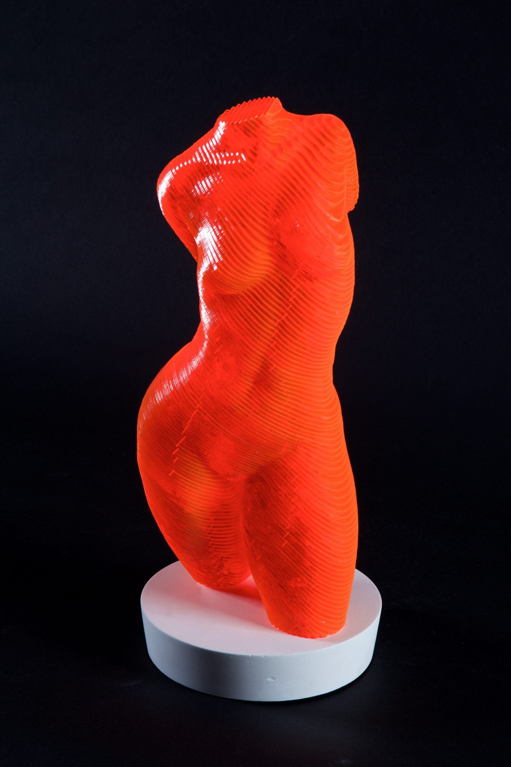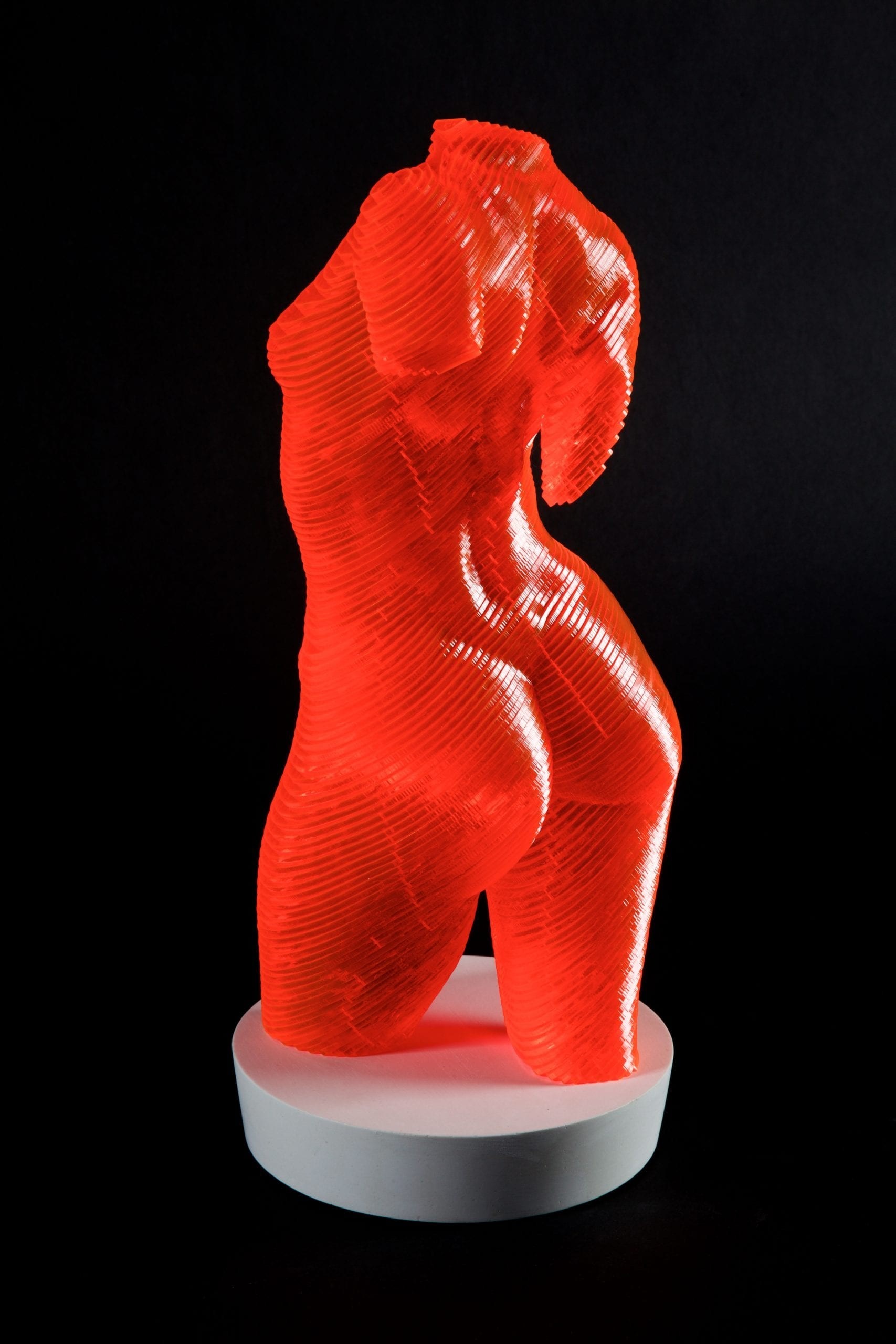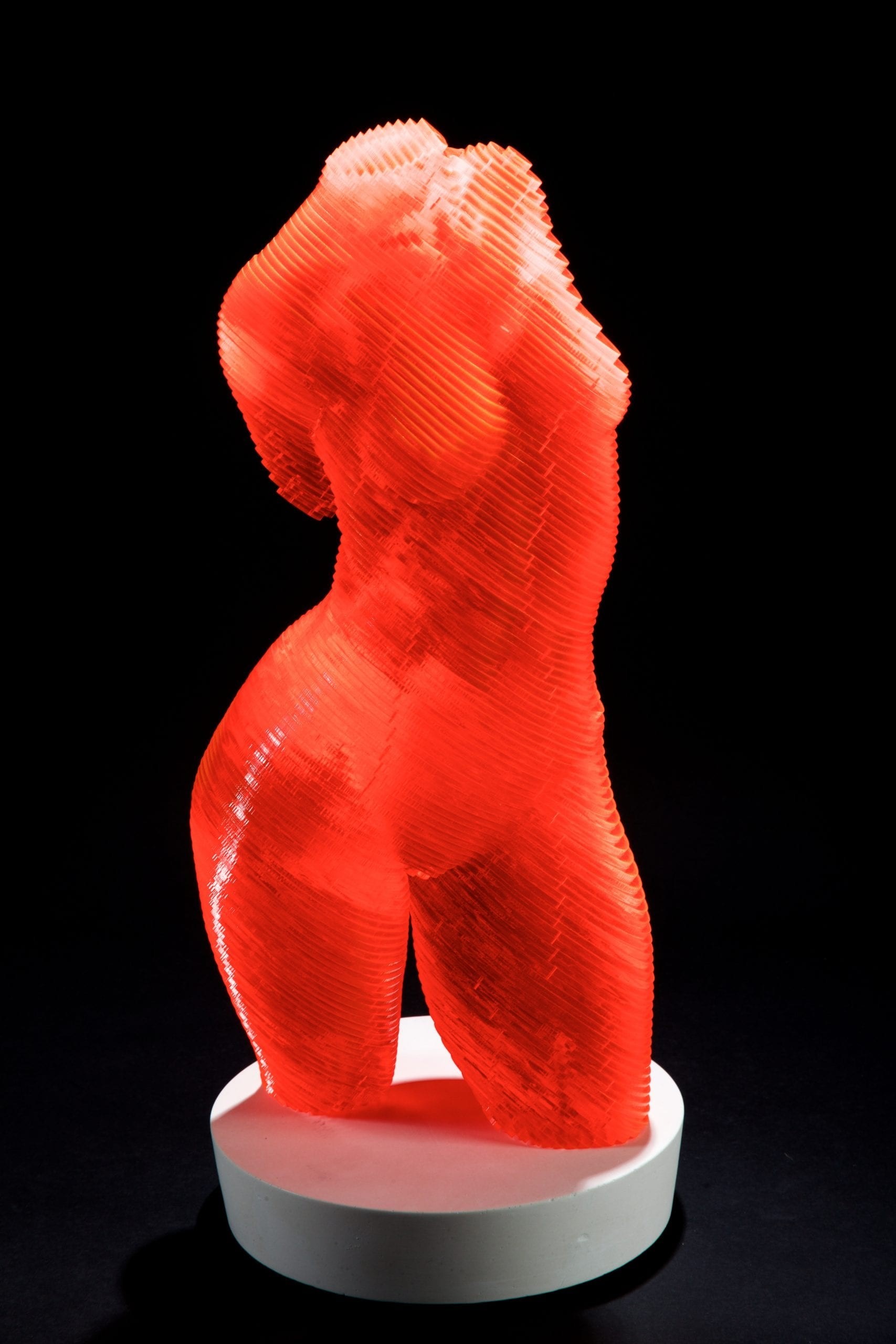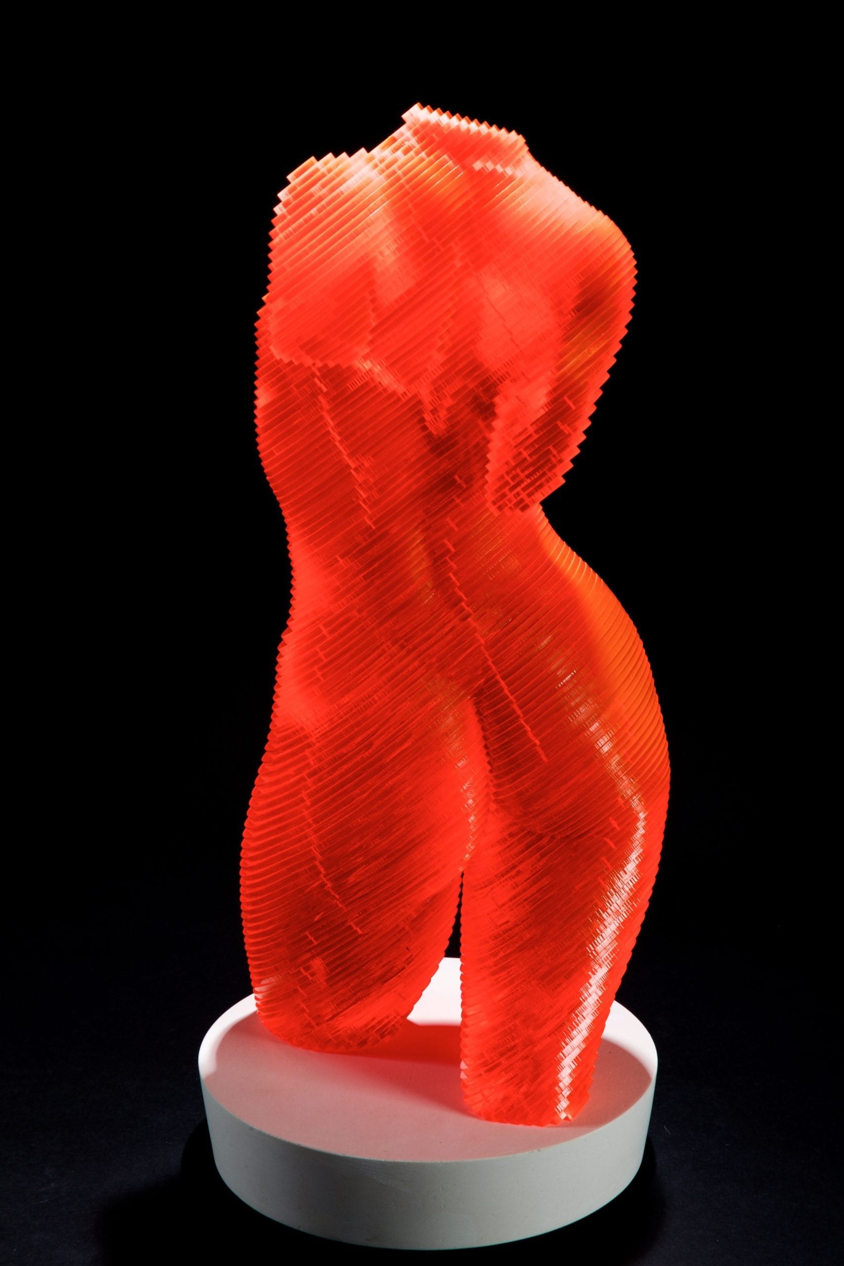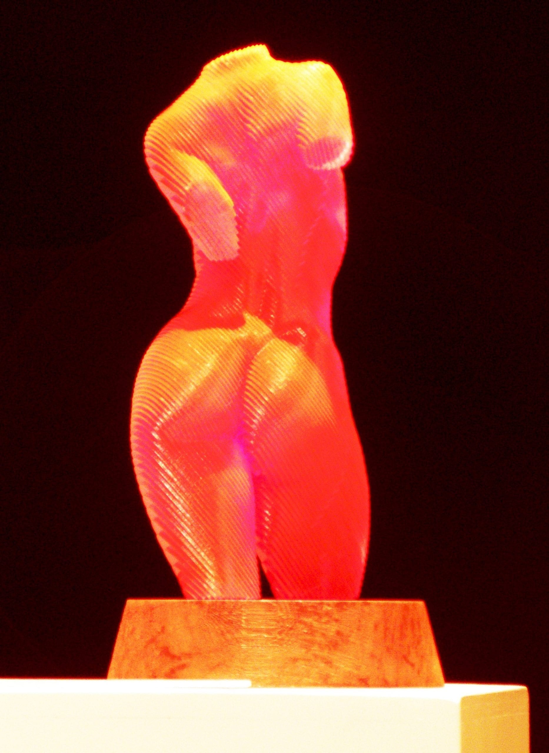 Œuvre originale de l'artiste Olivier Duhamel, illustre sa technique du lamellé-collé, créant une silhouette tridimensionnelle jouant avec la lumière. Ses reflets oranges et rouges lui donnent une apparence holographique, accentuant la fluidité et la sensualité du corps humain. Alliant innovation et tradition, l’œuvre témoigne de sa maîtrise de la forme et de son approche artistique unique.