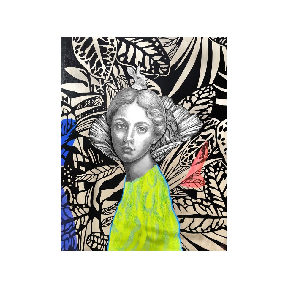 Original artwork by the artist Elia Pagliarino, features a classic figure and a playful rabbit against a graphic jungle background with touches of intense neon color. A striking visual that blends softness with a contemporary pop aesthetic.