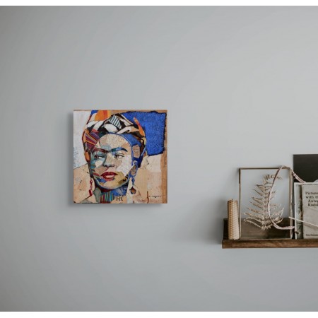 Origineel kunstwerk van Carme Magem, collagist bekend om zijn opmerkelijk expressieve portretten, samengesteld met krantenknipsels en fragmenten van oude brieven en geschriften.