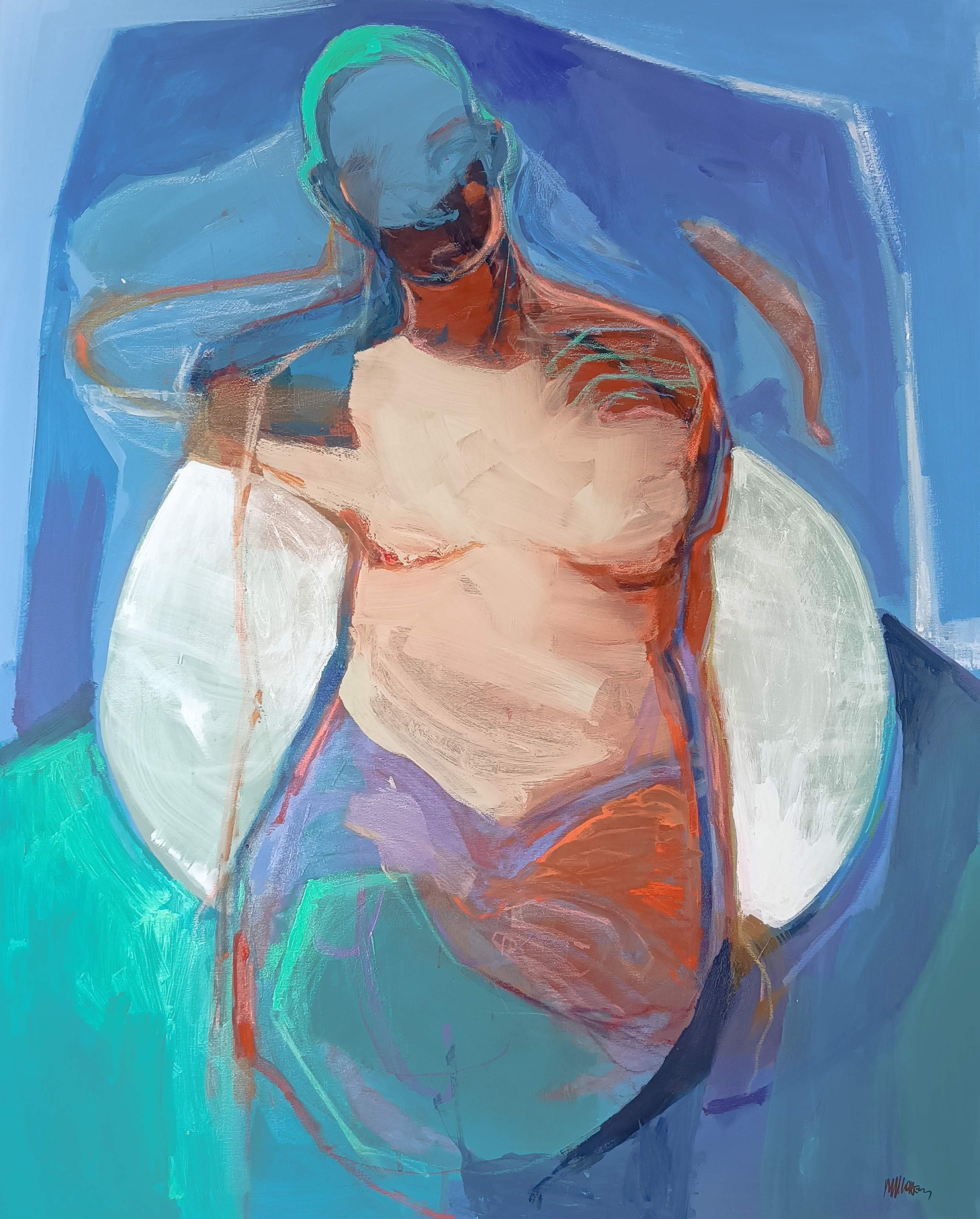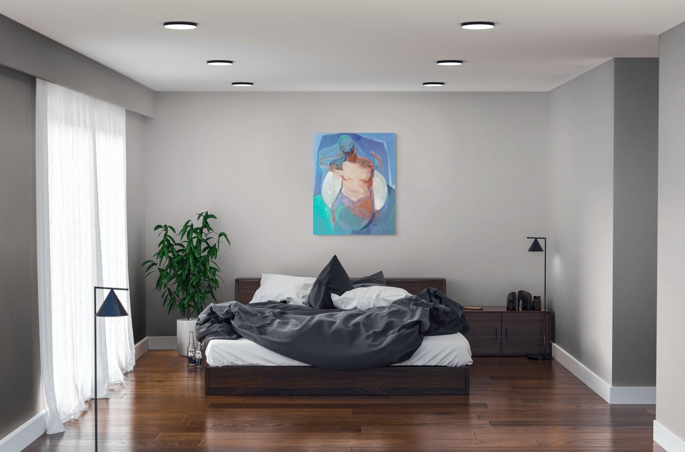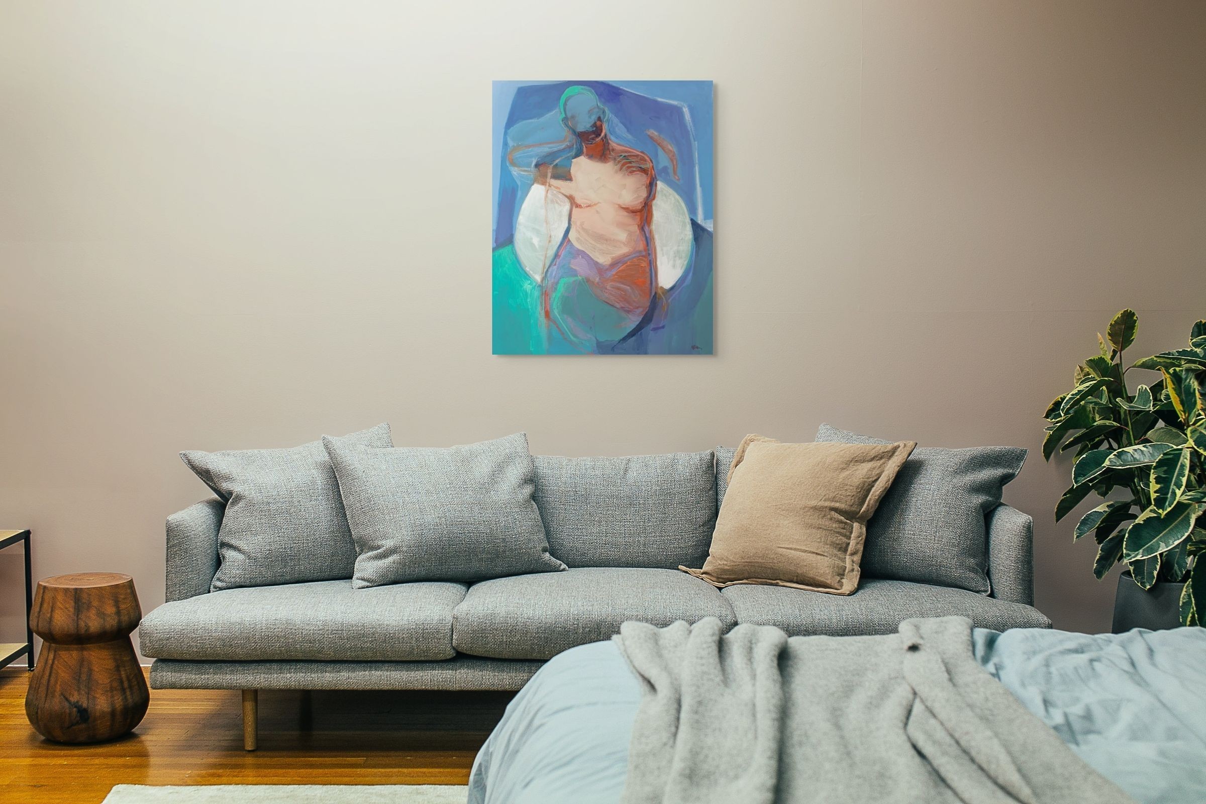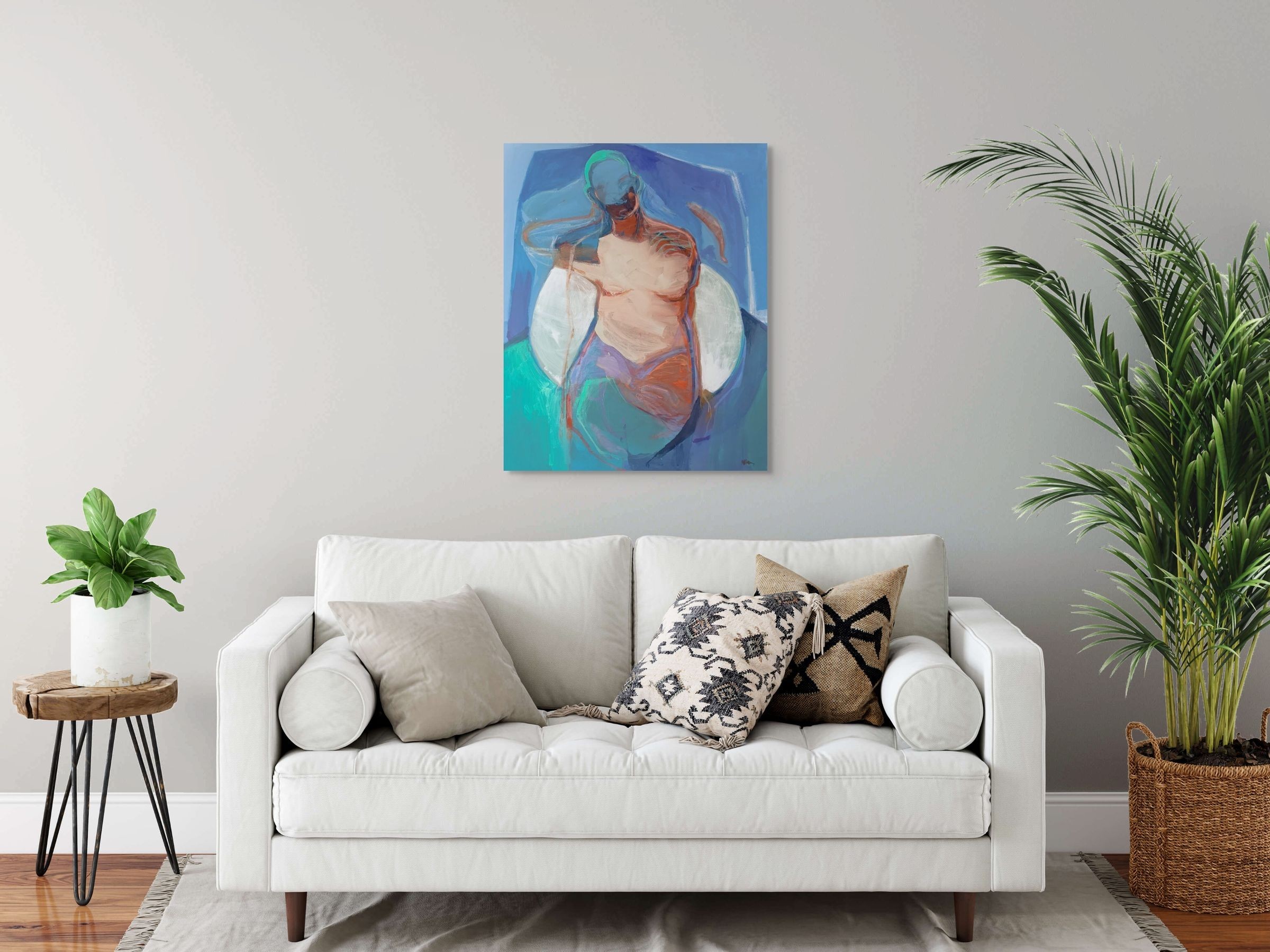 Origineel werk van de kunstenares Magdalena Morey, toont een abstract menselijk figuur, zwevend tussen kracht en kwetsbaarheid. Diepblauwe en warme terracottatinten wisselen af met een witte maankring, waardoor een introspectieve sfeer ontstaat. Een gebarenrijke en emotionele compositie, doordrenkt met stilte en innerlijk licht.